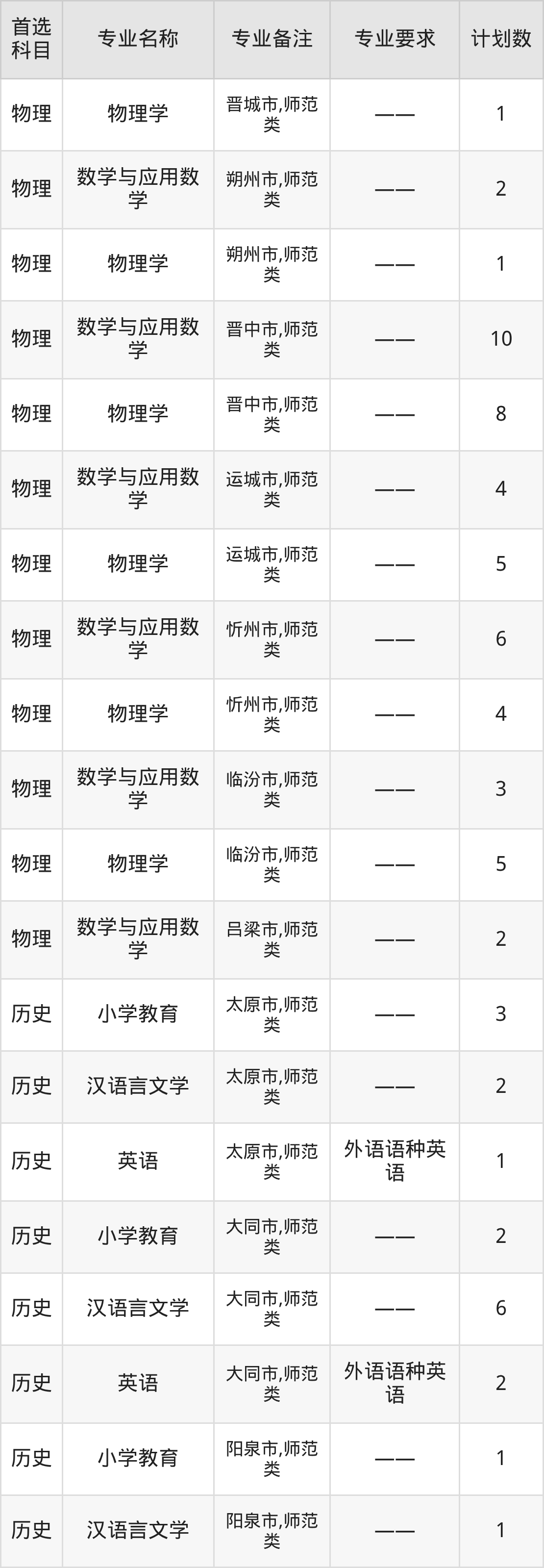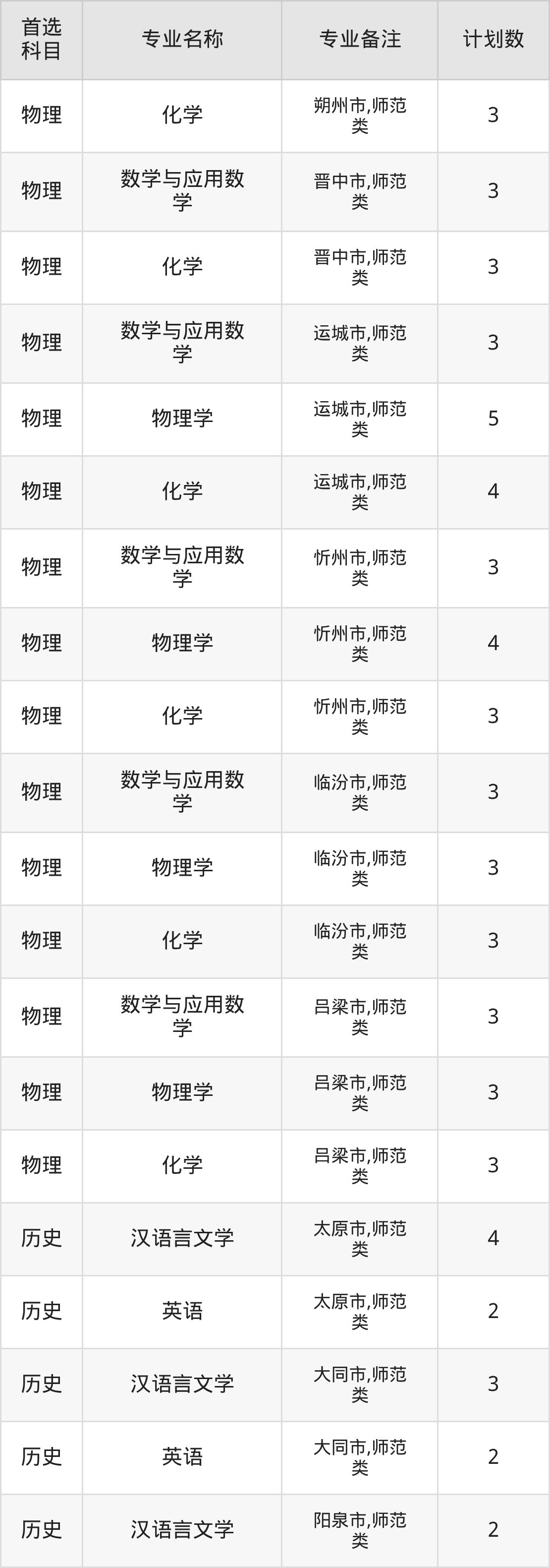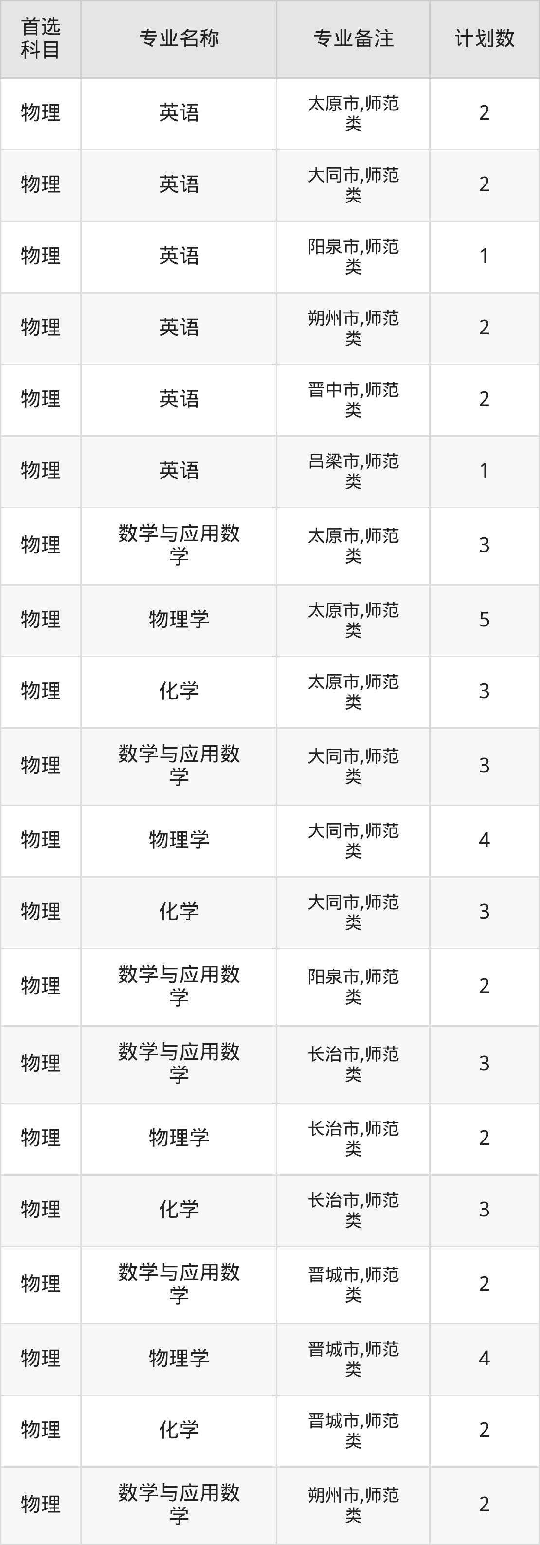 2025年太原师范学院在山西招生人数是180人,招生专业包括英语、数学与应用数学、物理学、化学、汉语言文学、思想政治教育。具体如下图所示: