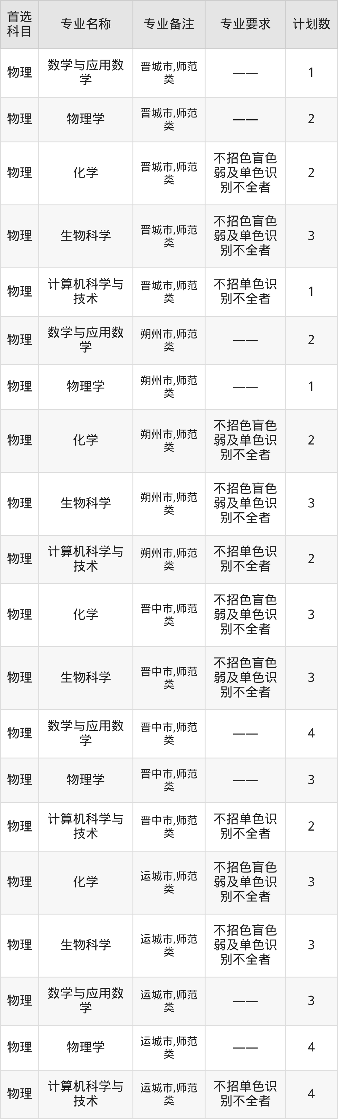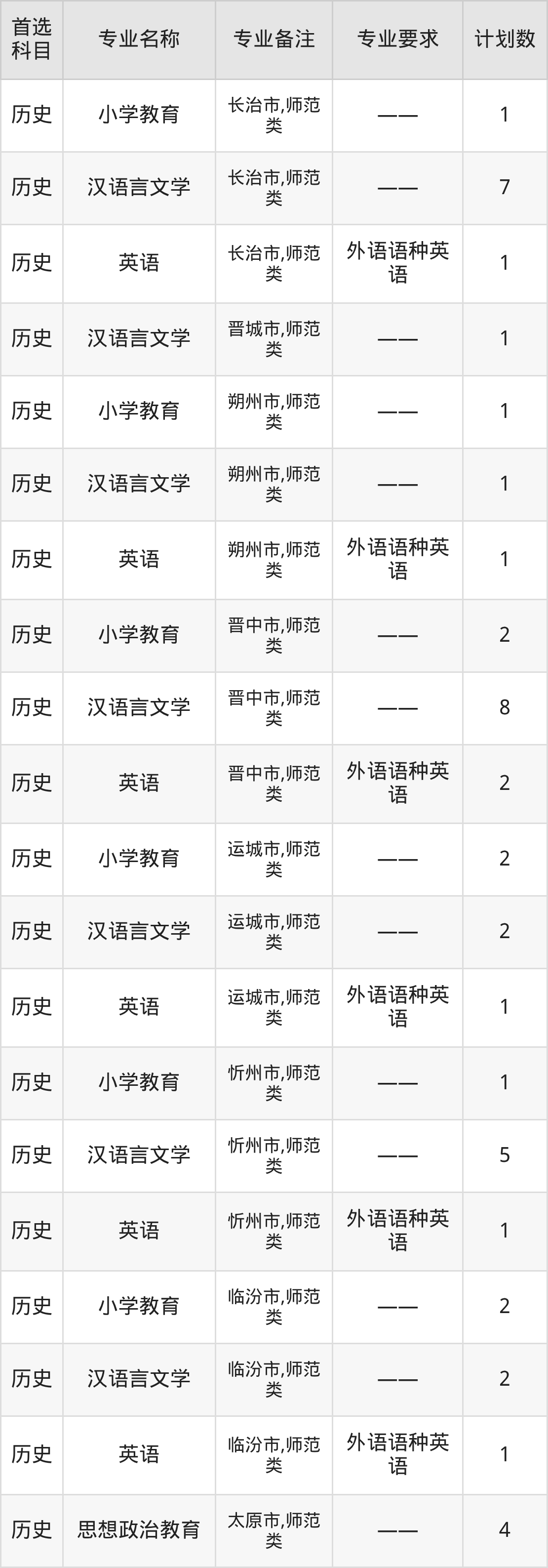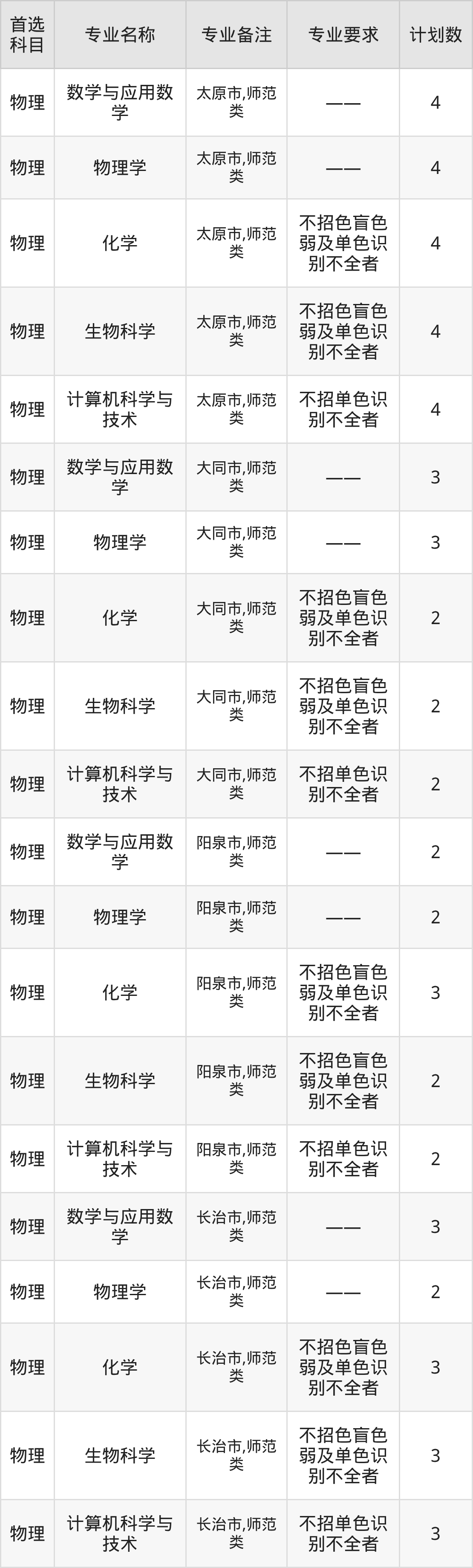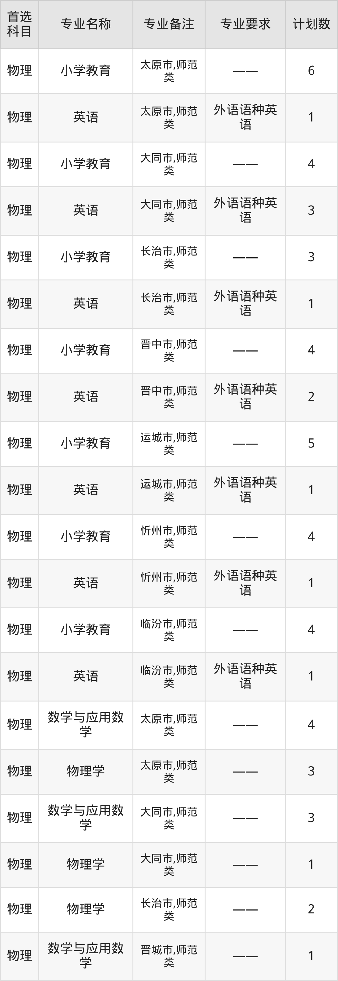 2025年太原师范学院在山西招生人数是180人,招生专业包括英语、数学与应用数学、物理学、化学、汉语言文学、思想政治教育。具体如下图所示: