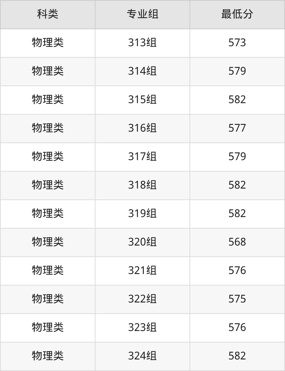 山西物理组考生最难考的是313组,2025年最低分607分,超学校该类最低分(574分)33分。最好考的则是335组,2025年最低分是574分。