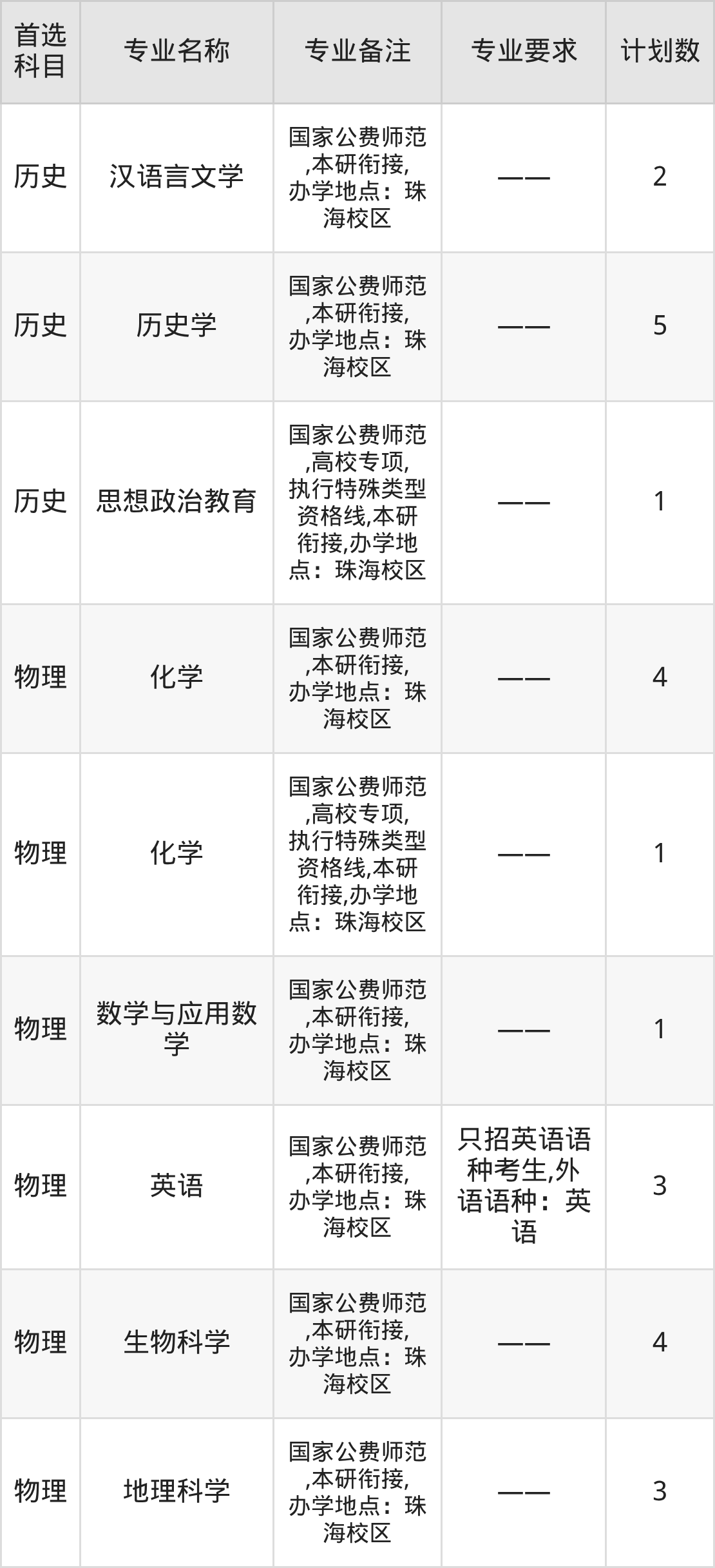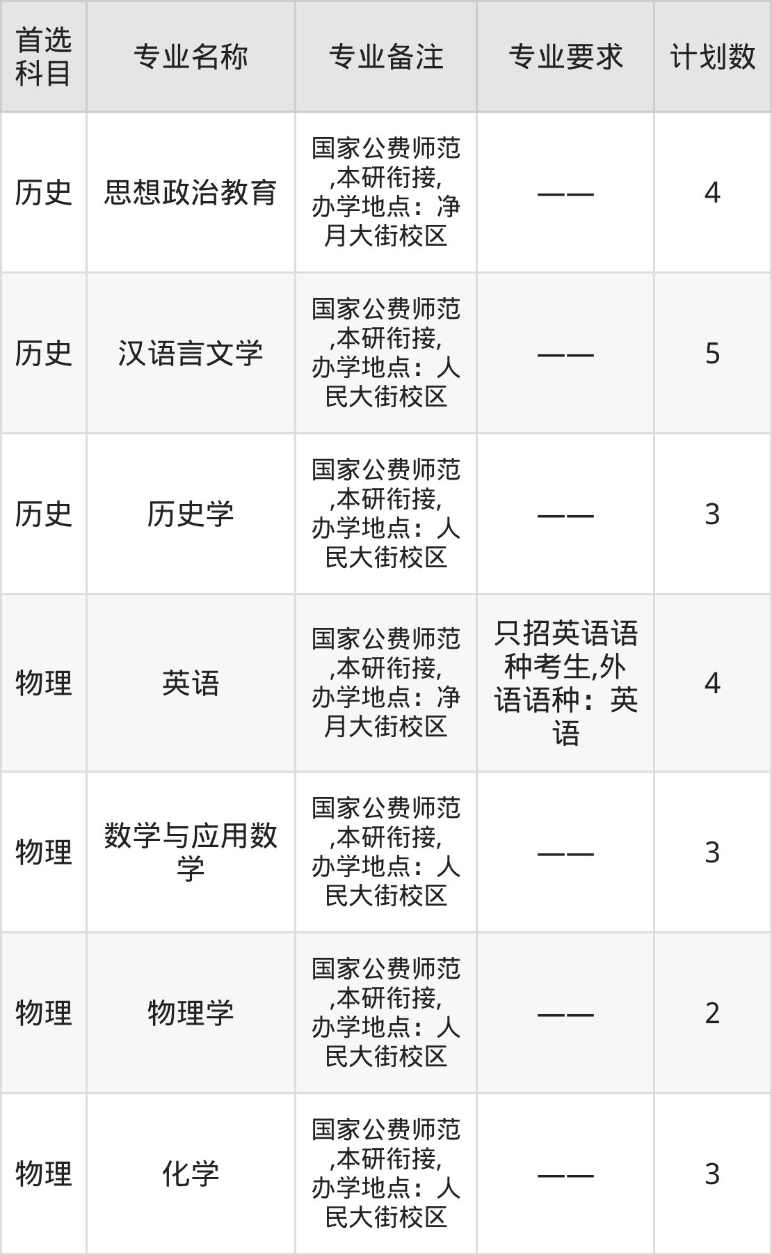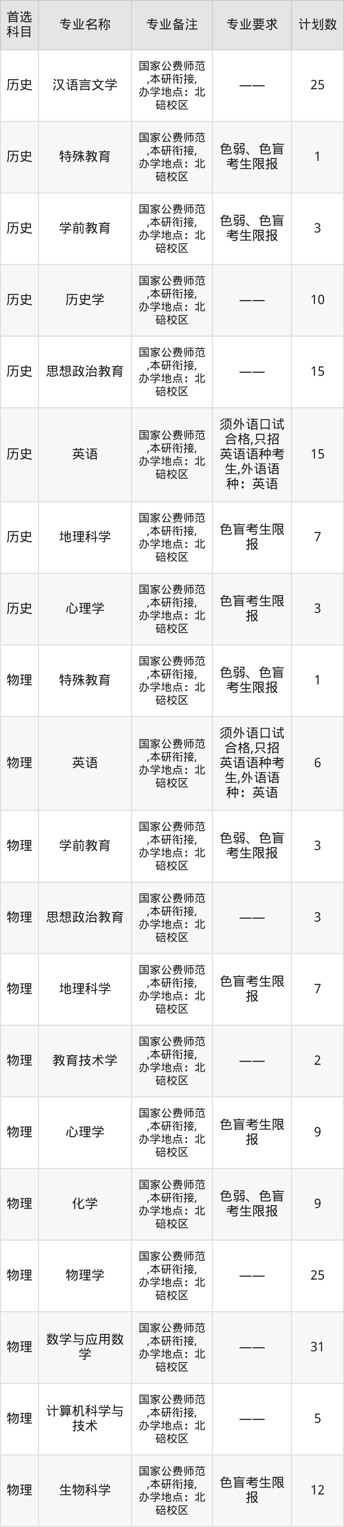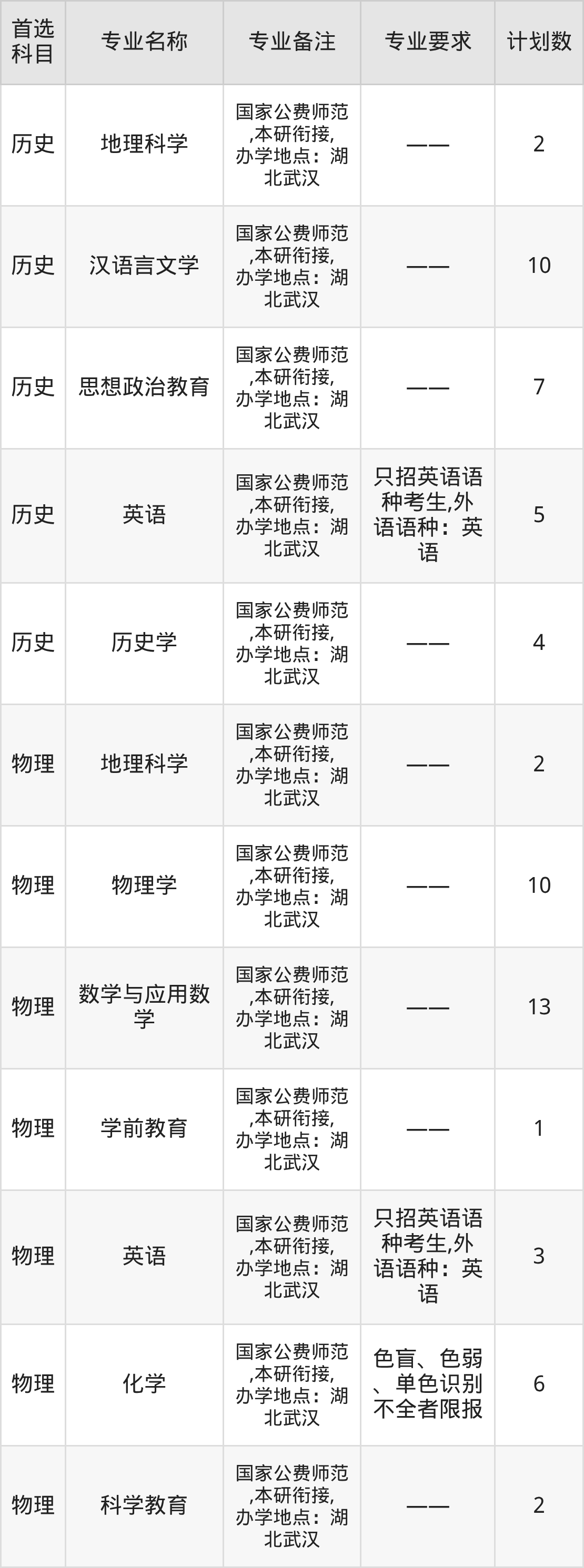 2025年华中师范大学在重庆招生人数是65人,招生专业包括地理科学、汉语言文学、思想政治教育、英语、历史学、物理学、数学与应用数学、学前教育、化学、科学教育。具体如下图所示: