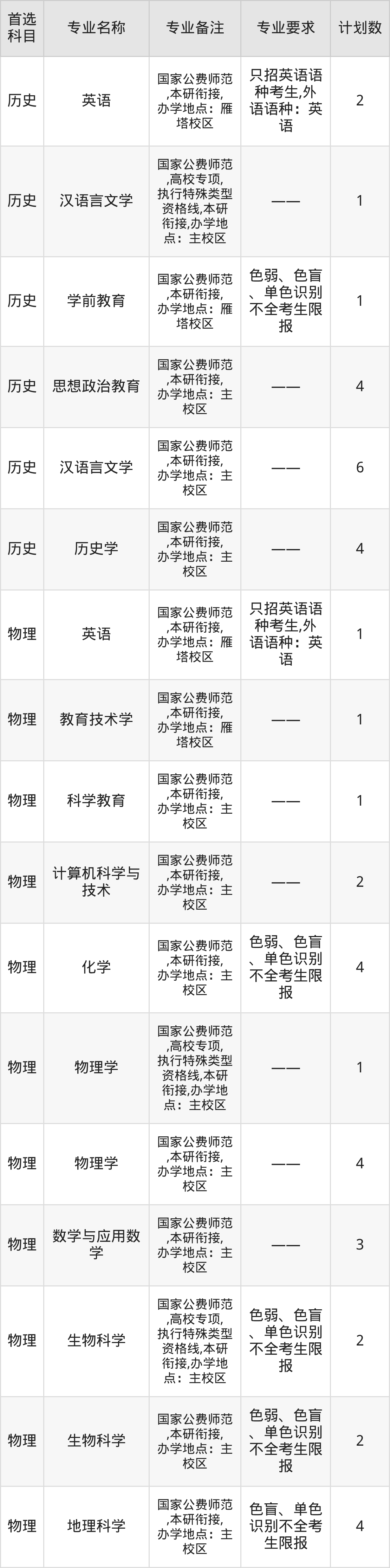 2025年陕西师范大学在重庆招生人数是43人,招生专业包括英语、汉语言文学、学前教育、思想政治教育、历史学、教育技术学、科学教育、计算机科学与技术、化学、物理学等。具体如下图所示: