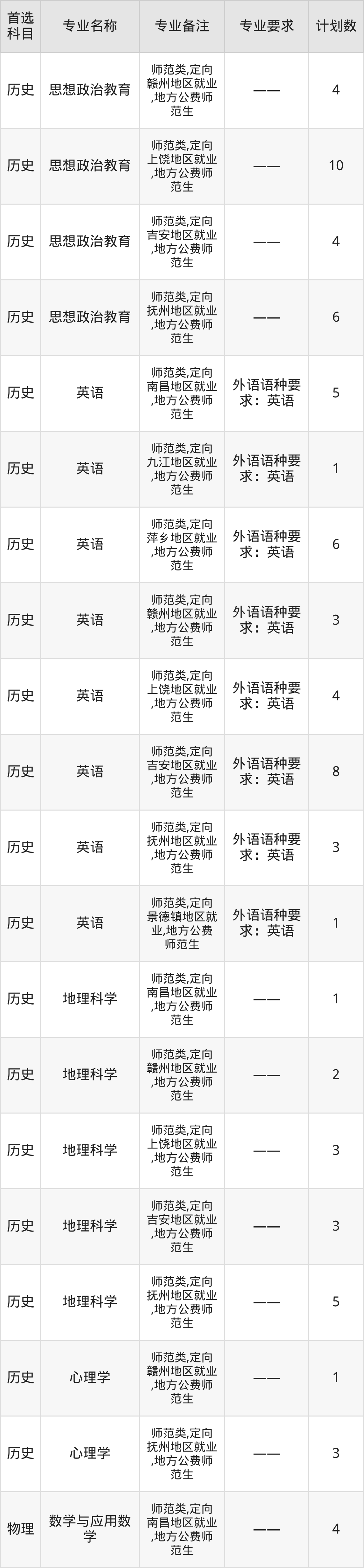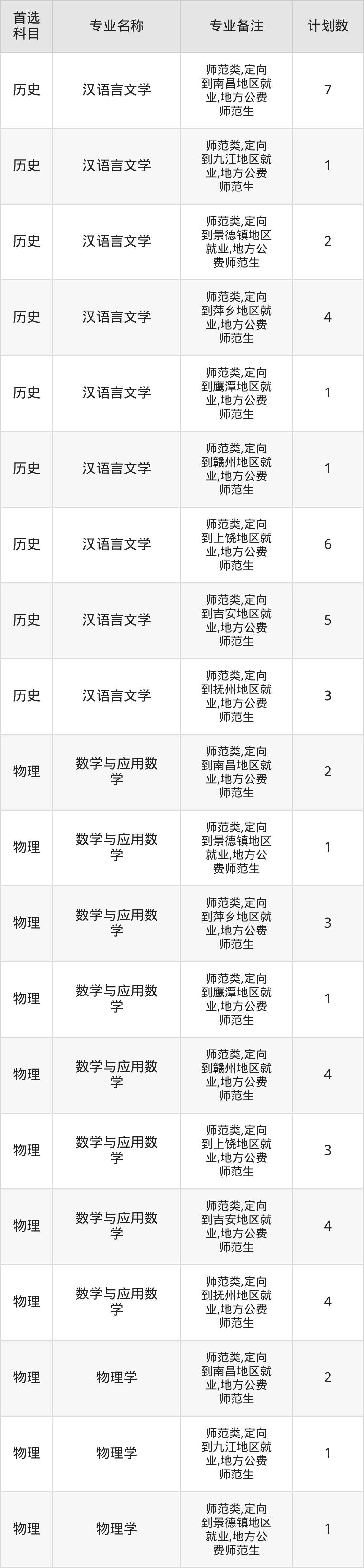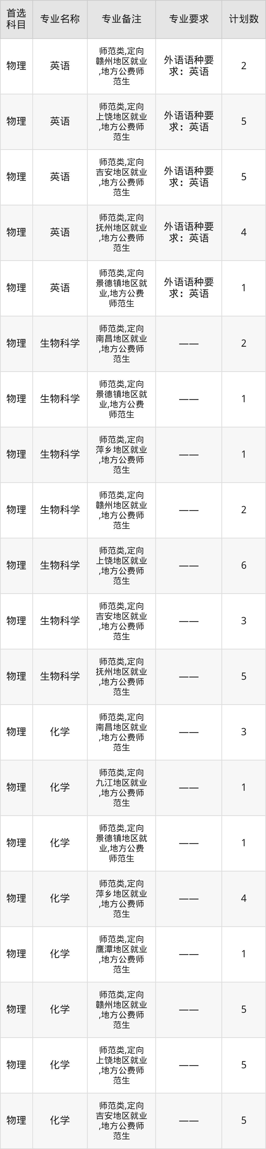 2025年赣南师范大学在江西招生人数是109人,招生专业包括汉语言文学、数学与应用数学、物理学、化学。具体如下图所示: