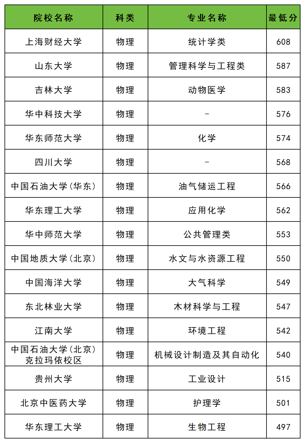 2025年广西高校专项物理类录取分数线位于497分到608分之间,收分最低的是华东理工大学生物工程专业,收分最高的是上海财经大学统计学类专业,各校各专业具体分数线如下。