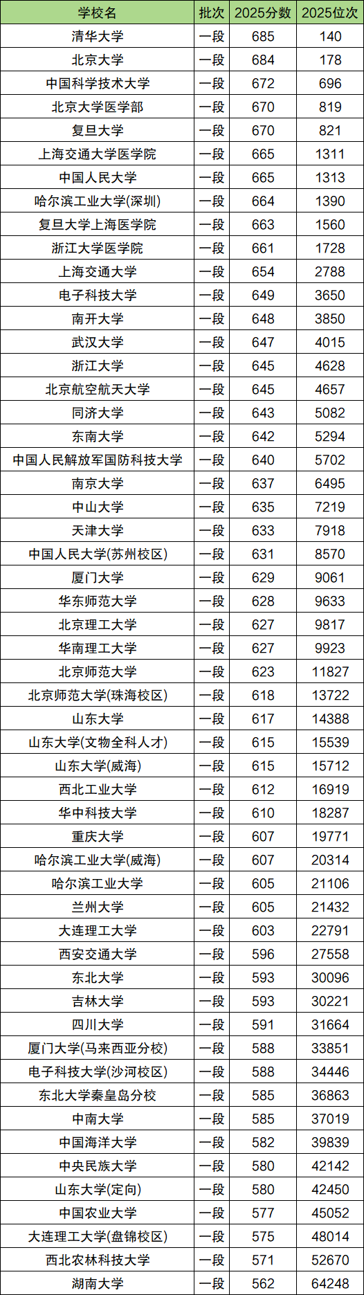 绝对最高梯队(680分+):清华大学(685分)、北京大学(684分)。这两校常年领跑,仅相差1分,属于“金字塔尖”,非顶尖学霸不可触碰。