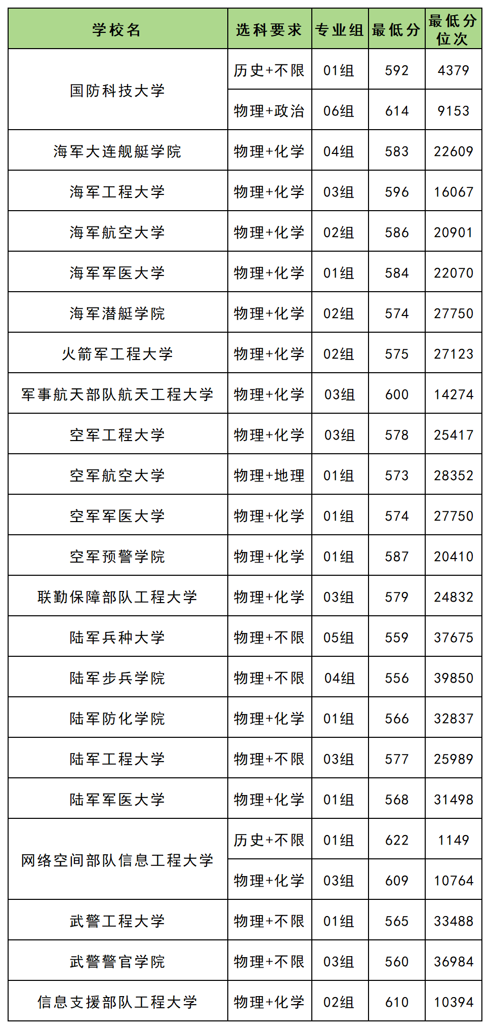 2025年全部军校在湖北招生最低录取分数线一览表: