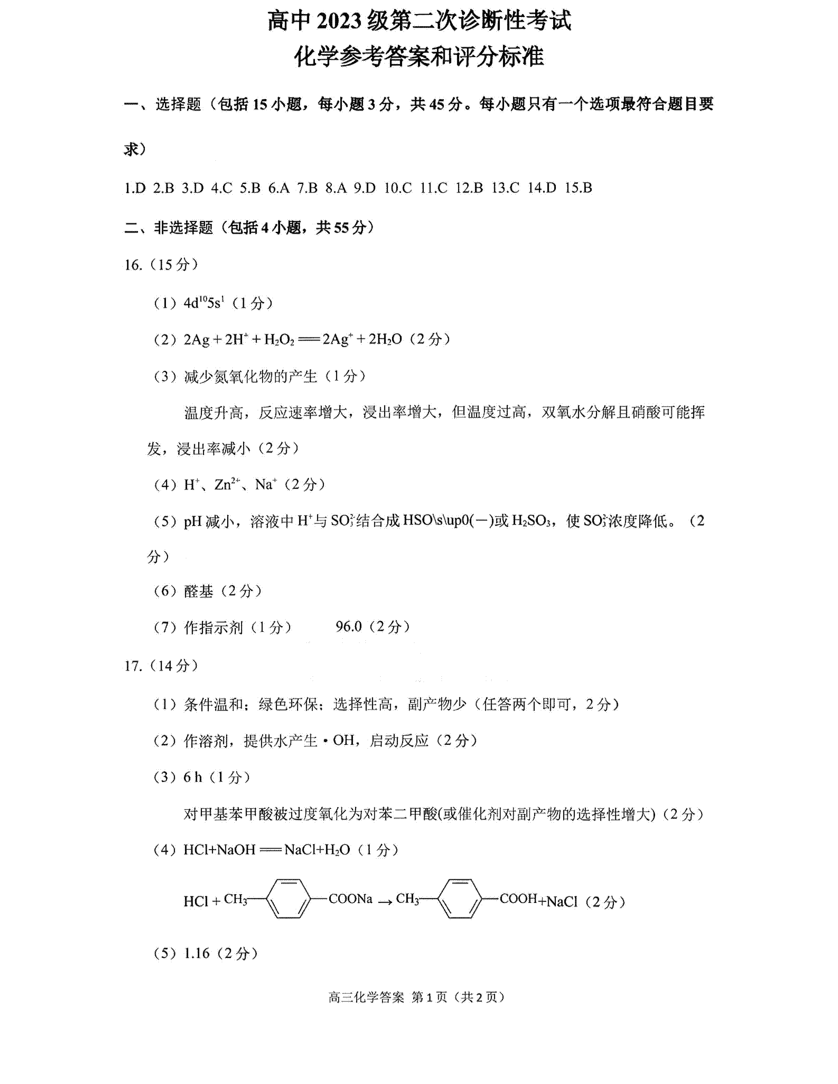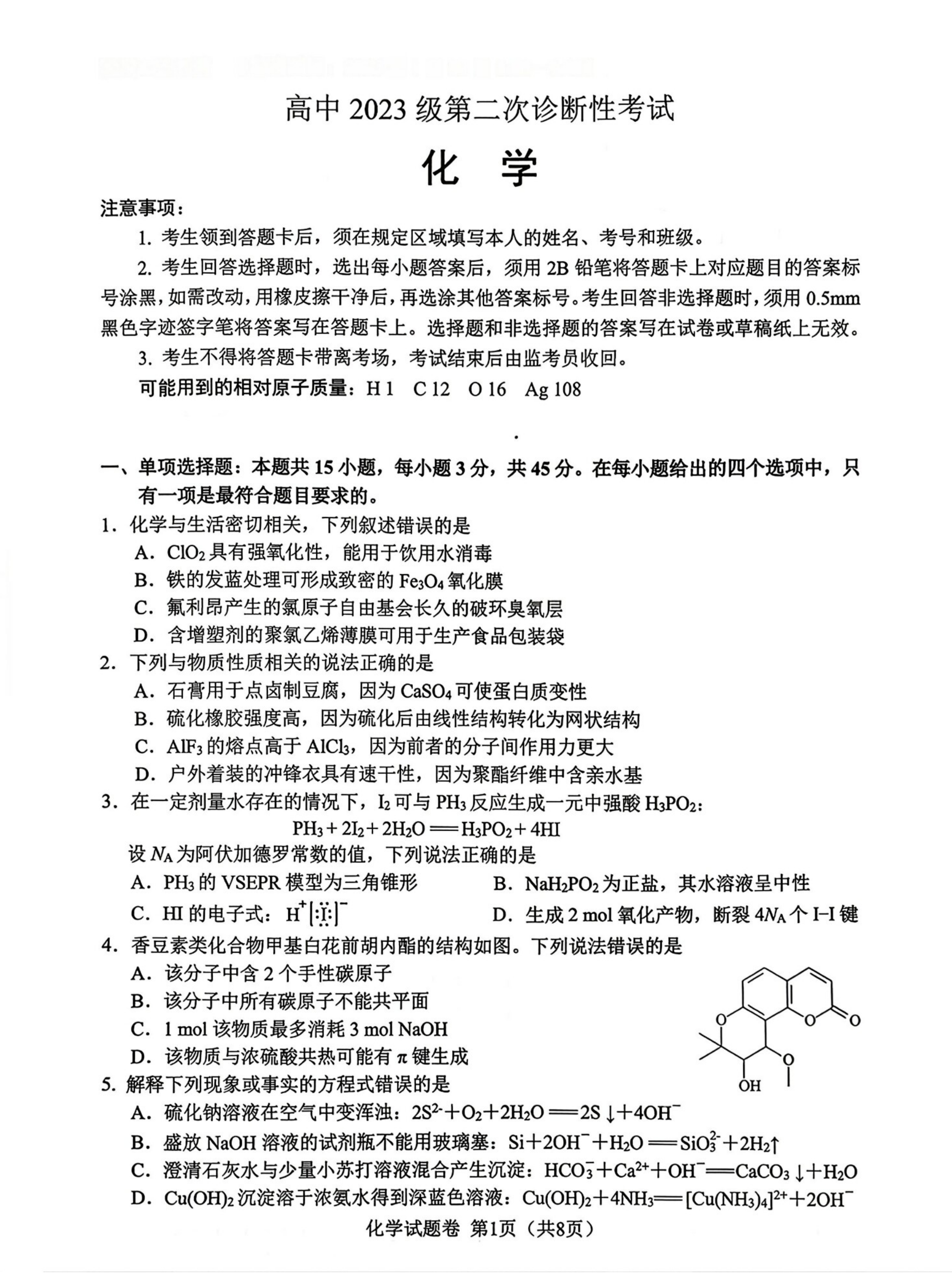 6、2026绵阳二诊化学试题及参考答案