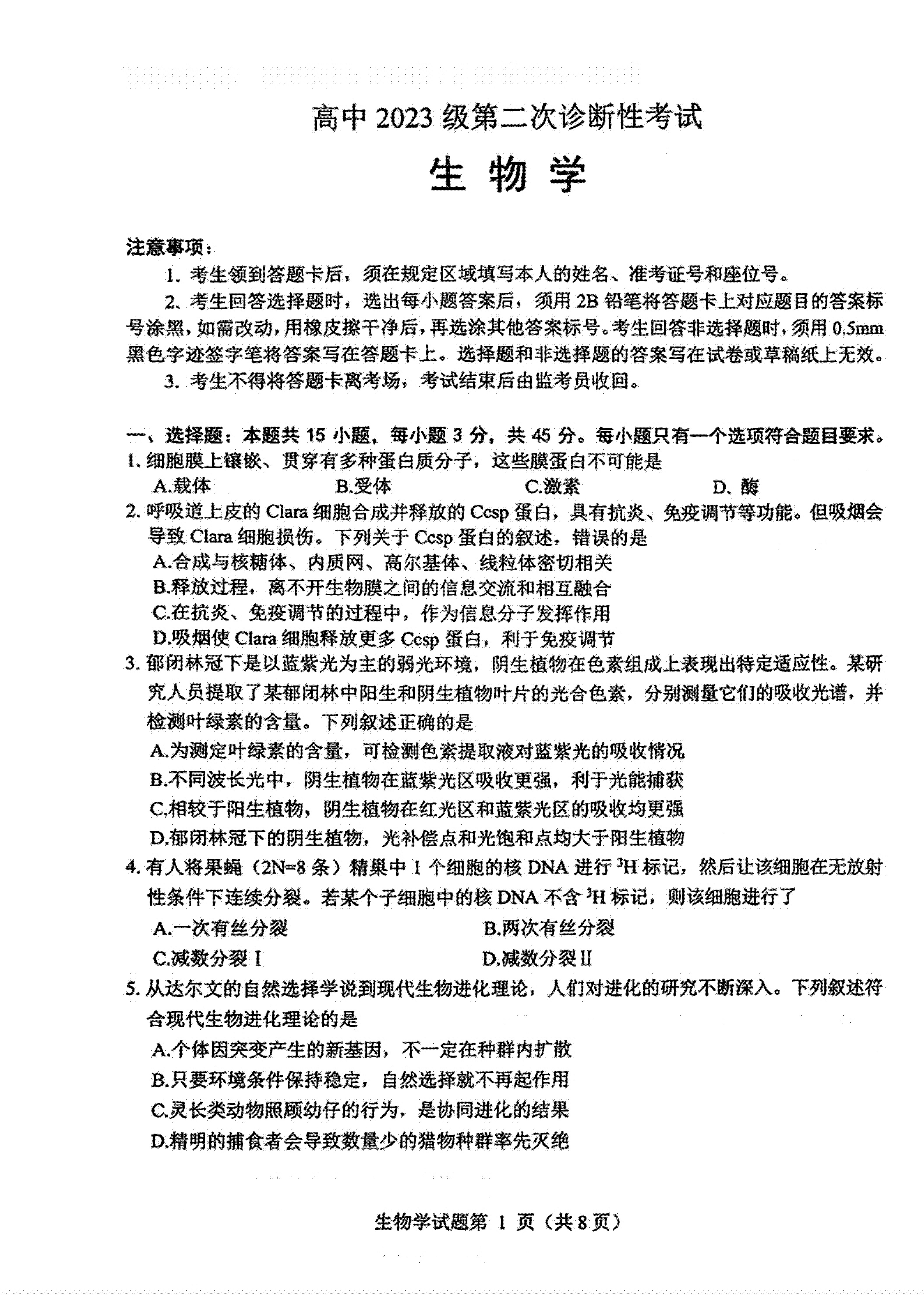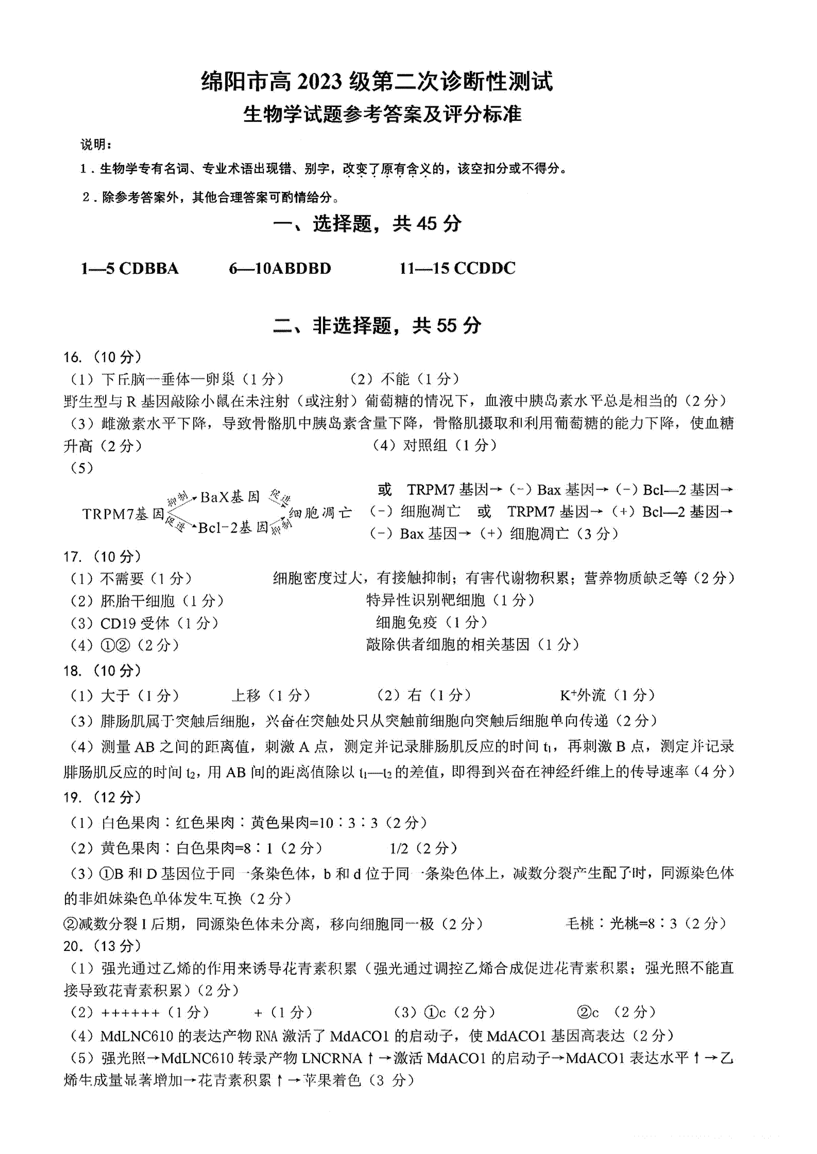 9、2026绵阳二诊生物试题及参考答案