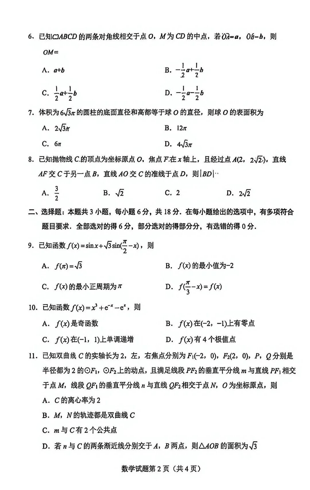 2、2026绵阳二诊数学试题及参考答案