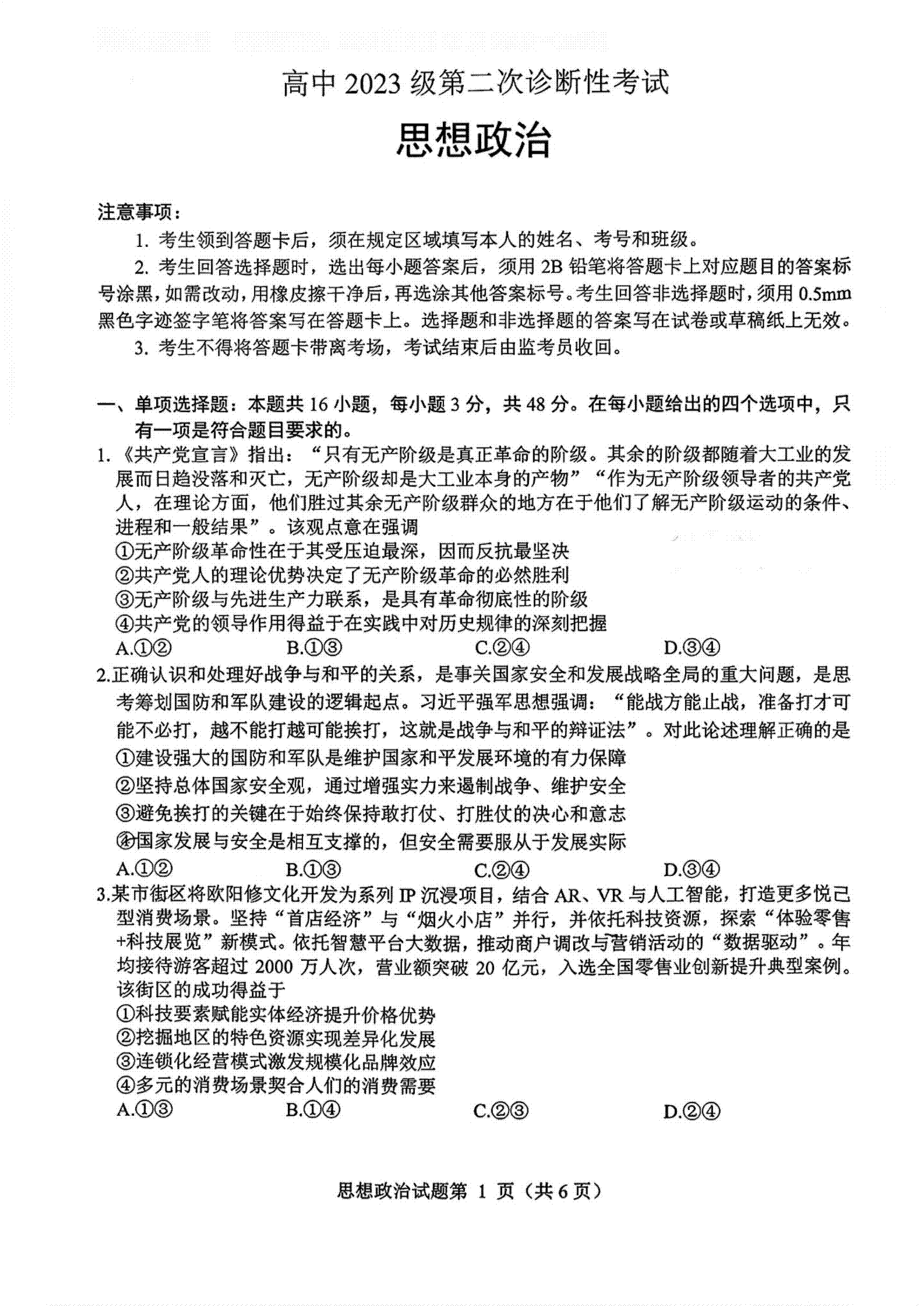 8、2026绵阳二诊政治试题及参考答案