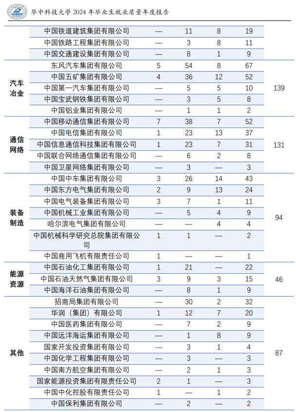 除了上述国企巨头,华为投资控股有限公司、华中科技大学同济医学院附属同济医院、华中科技大学同济医学院附属协和医院、阿里巴巴集团、比亚迪股份有限公司、紫光集团等行业龙头,也纷纷向华科学子抛来橄榄枝,就业去向覆盖科技、医疗、互联网等黄金赛道,质量直接拉满!