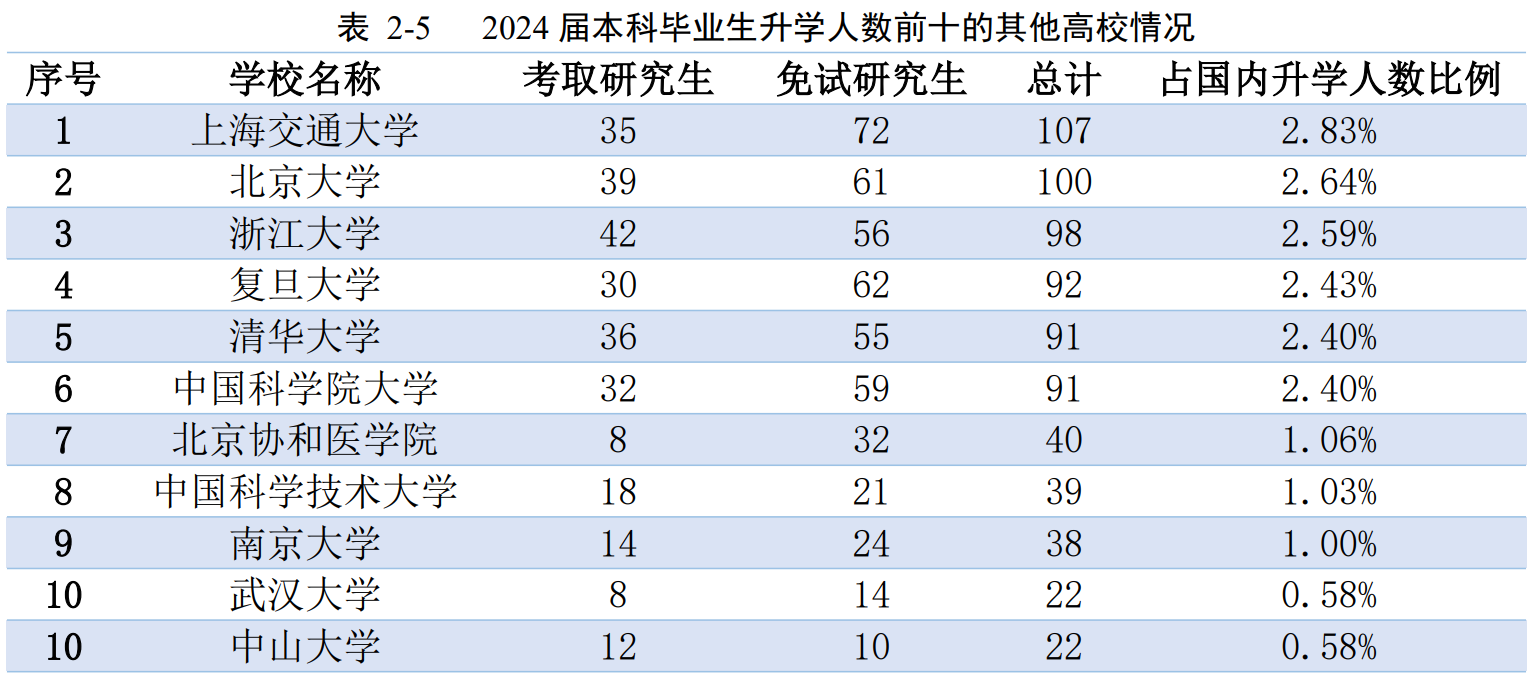 上海交通大学107人(含72人保研)、北京大学100人(含61人保研)、浙江大学98人(含56人保研)、复旦大学92人(含62人保研)、清华大学91人(含55人保研)、中国科学院大学91人(含59人保研)。保研名额占比极高,足以看出学校的硬实力有多能打!