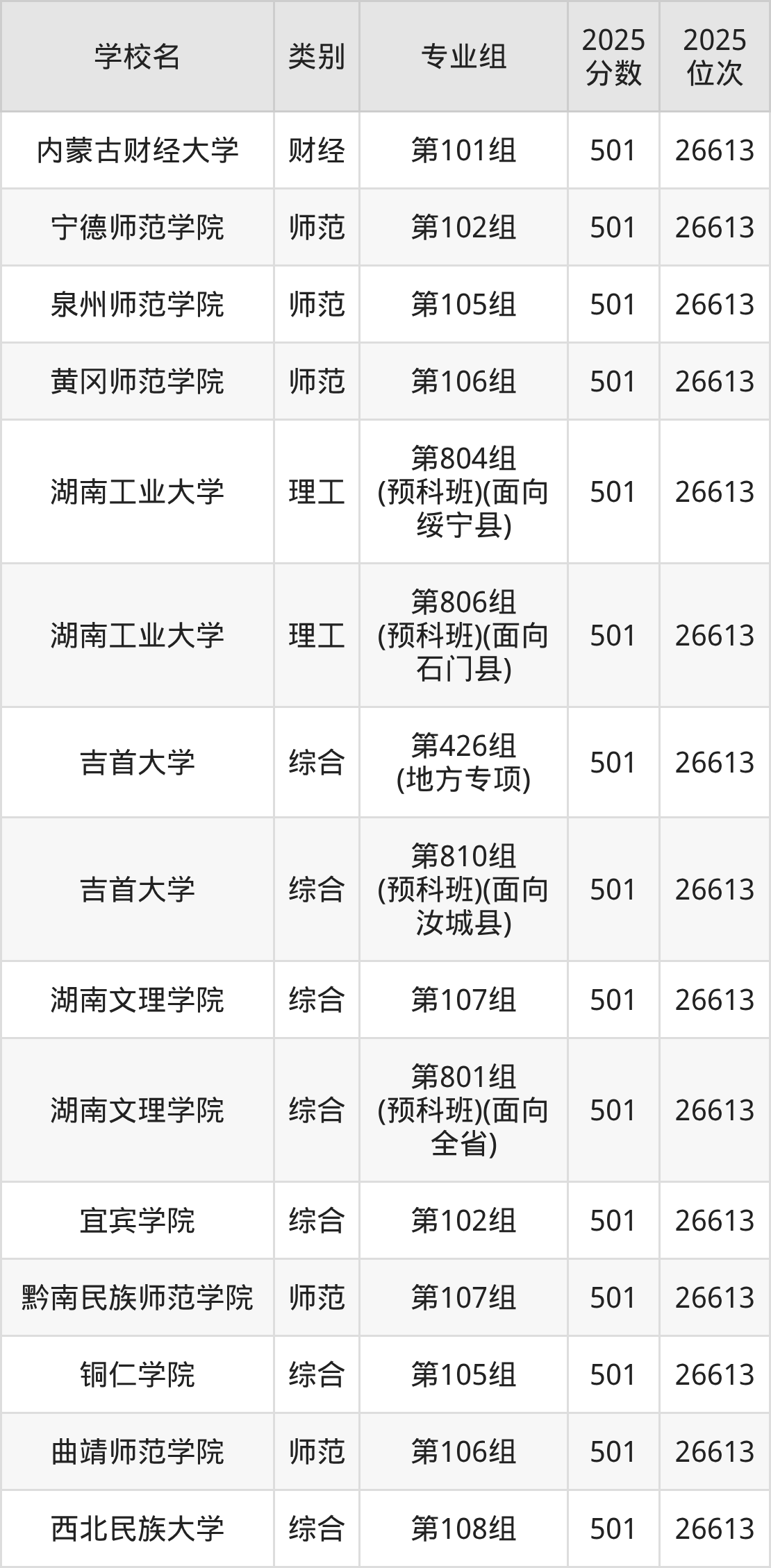 文科501分左右的湖南考生可以选择的好大学共计12所,包括吉首大学(省重点)第426组(地方专项)501分、吉首大学(省重点)第810组(预科班)(面向汝城县)501分、湖南工业大学(省重点)第804组(预科班)(面向绥宁县)501分、湖南工业大学(省重点)第806组(预科班)(面向石门县)501分、西北民族大学(省重点)第108组501分等。