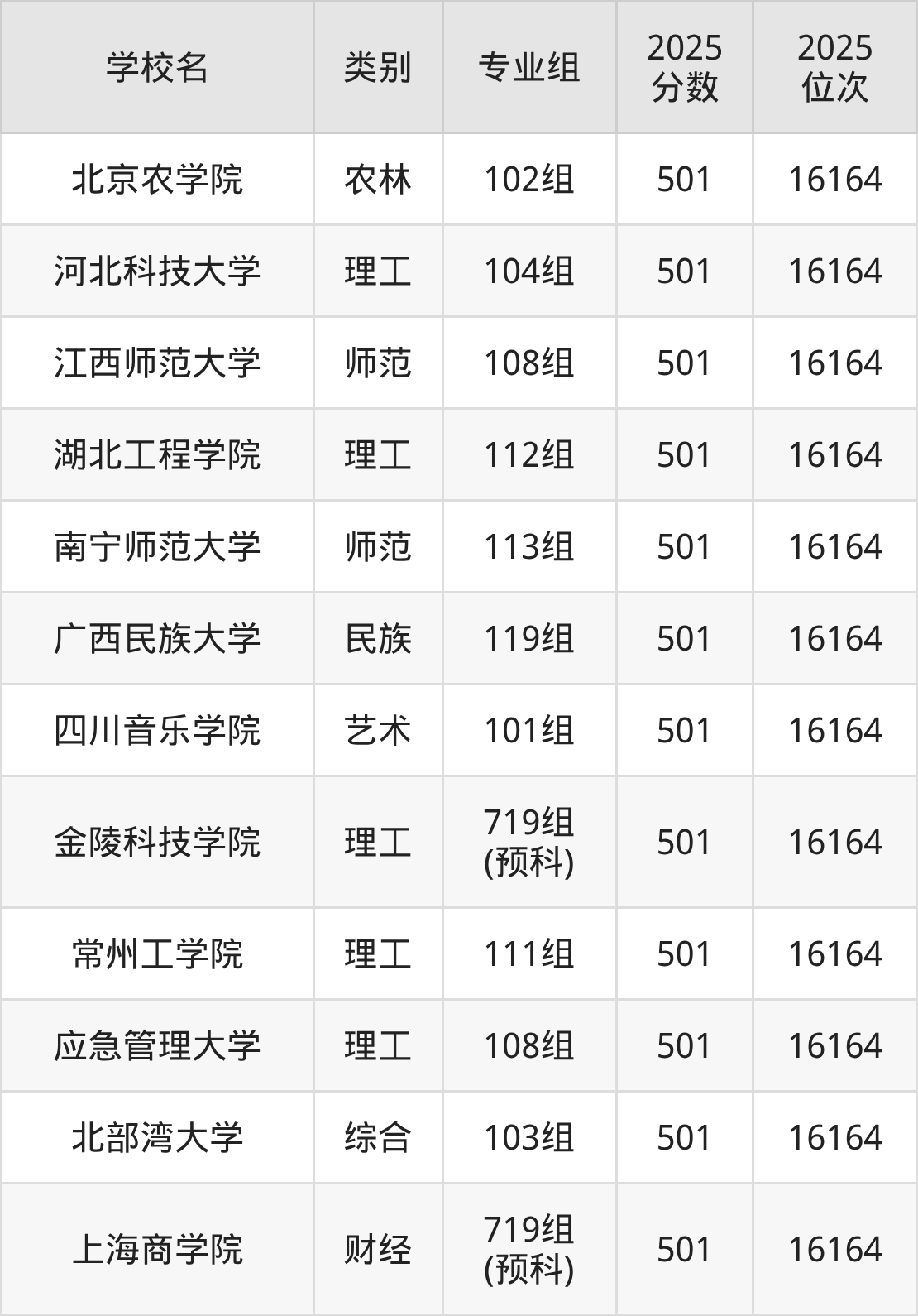 文科501分左右的广西考生可以选择的好大学共计12所,包括广西民族大学(省重点)119组501分、江西师范大学(省重点)108组501分、河北科技大学(省重点)104组501分、上海商学院(双万计划)719组(预科)501分、北京农学院(双万计划)102组501分等。