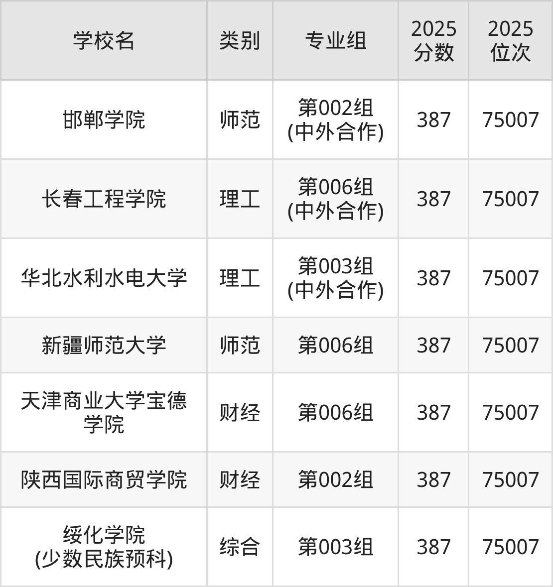 理科387分左右的黑龙江考生可以选择的本科大学共计7所,包括新疆师范大学(省重点)第006组387分、华北水利水电大学(双万计划)第003组(中外合作)387分、绥化学院(少数民族预科)(双万计划)第003组387分、邯郸学院(双万计划)第002组(中外合作)387分、长春工程学院(双万计划)第006组(中外合作)387分等。