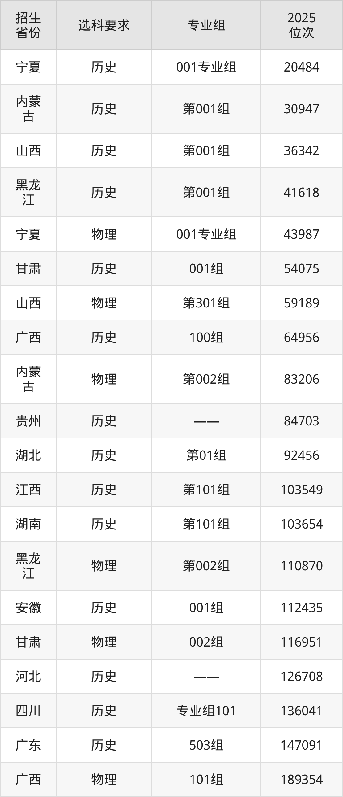 淮南职业技术学院2025年在全国各省的位次差异较大,最高位次是20484位(宁夏历史类)、最低位次是347367位(广东物理类)。各省具体位次请看下图: