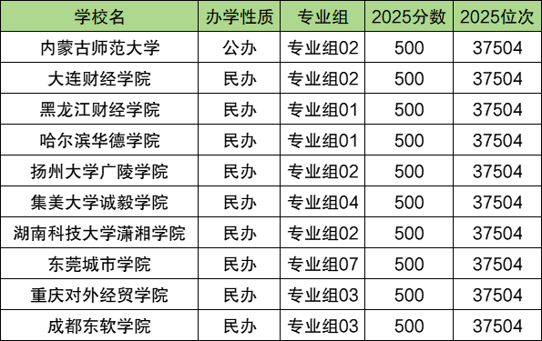 海南高考500分最低位次是37504名,对应能上的学校有大连财经学院02组、哈尔滨华德学院01组、东莞城市学院07组、成都东软学院03组等,具体名单如下表所示: