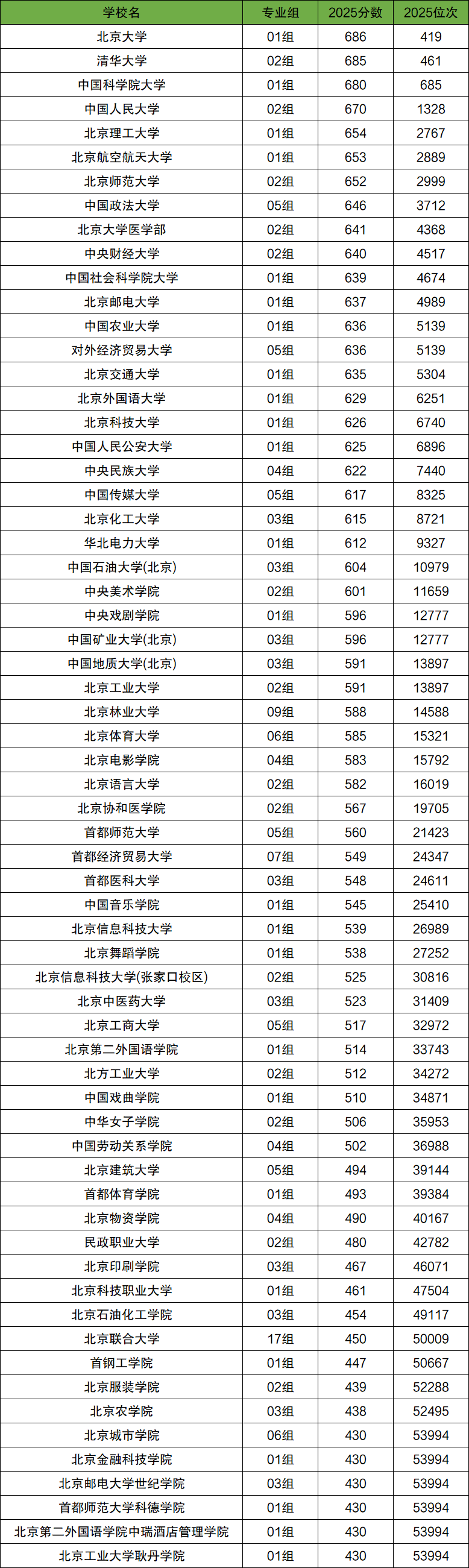 本文数据来自北京教育考试院发布的2025普通类本科批投档文件,文章仅收集了北京市内本科院校分数。