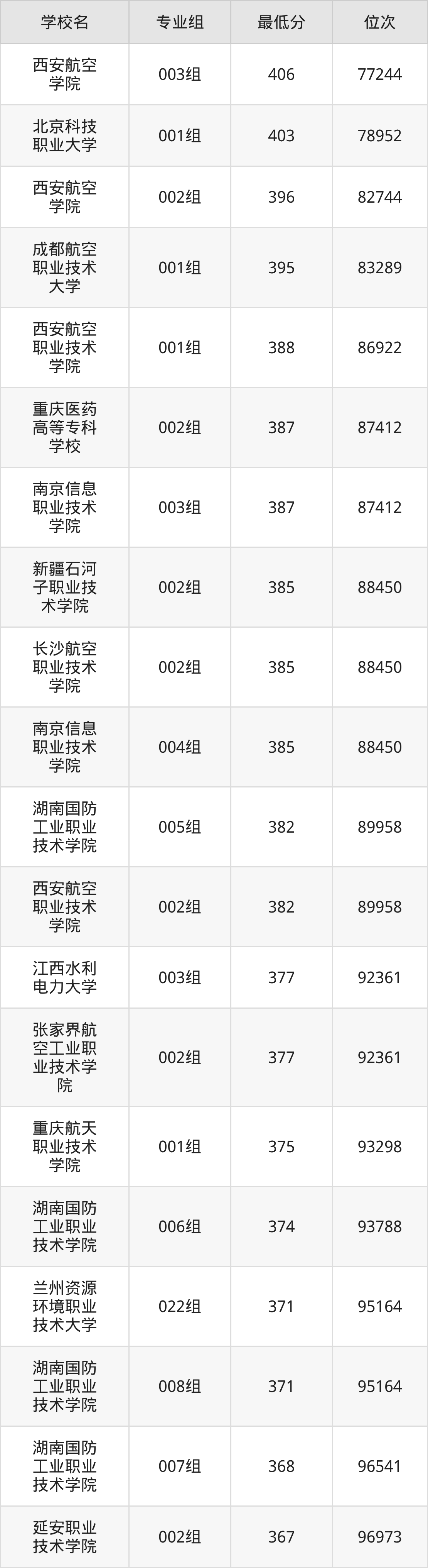 (4)重庆医药高等专科学校:2025年定向士官分数线387分,位次是87412名,招生专业组有1个,最低为002组。