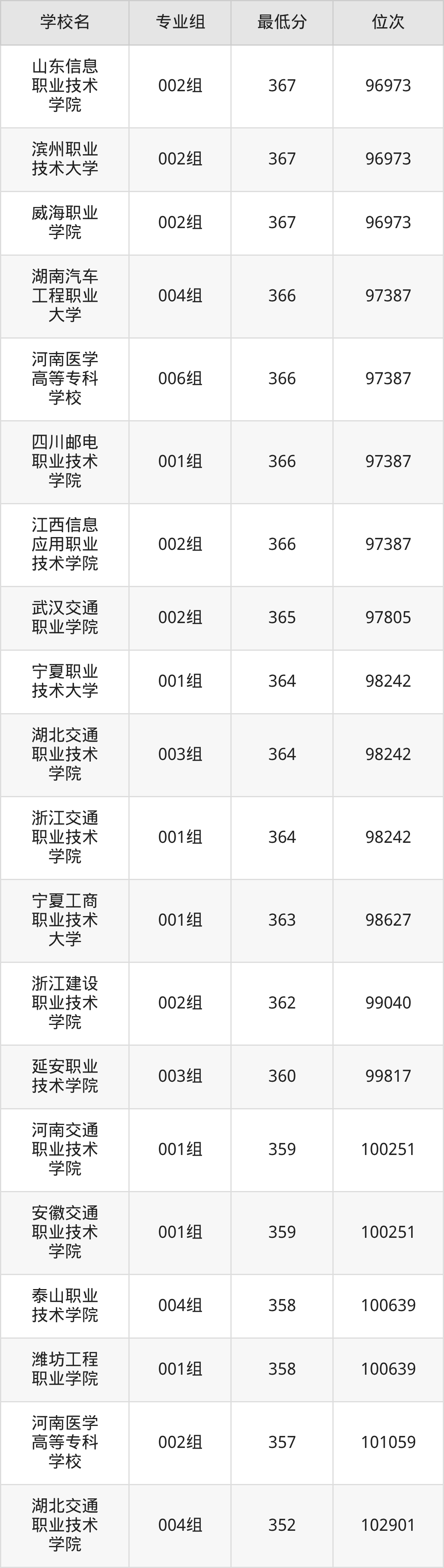 (6)山东信息职业技术学院:2025年定向士官分数线367分,位次是96973名,招生专业组有1个,最低为002组。