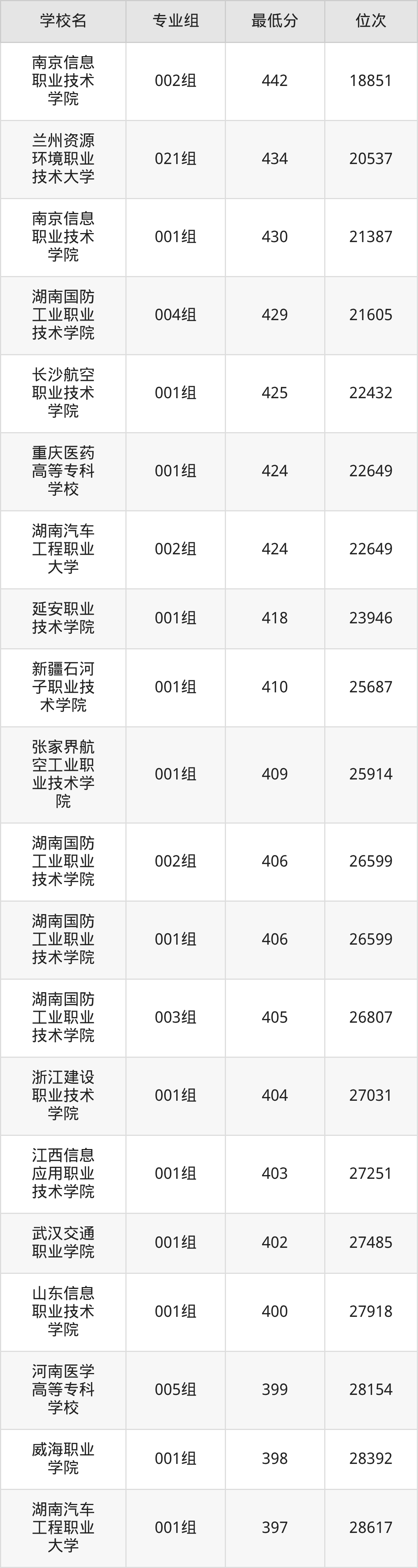 (2)山东信息职业技术学院:2025年定向士官分数线400分,位次是27918名,招生专业组有1个,最低为001组。