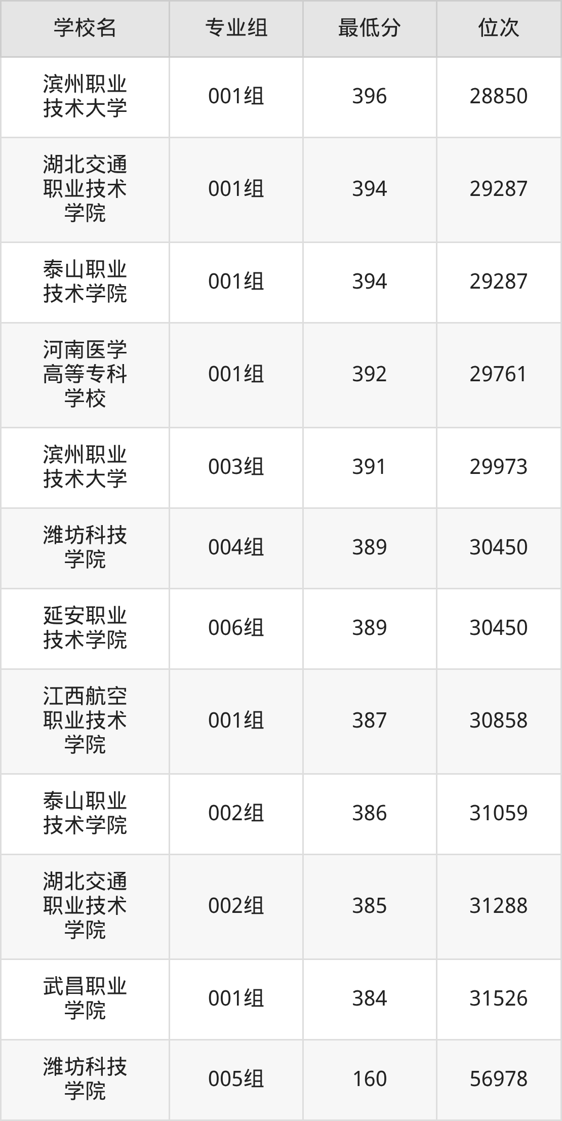 (4)滨州职业技术大学:2025年定向士官分数线391分到396分,位次区间是29973名到28850名,招生专业组有2个,最低为003组、最高为001组。