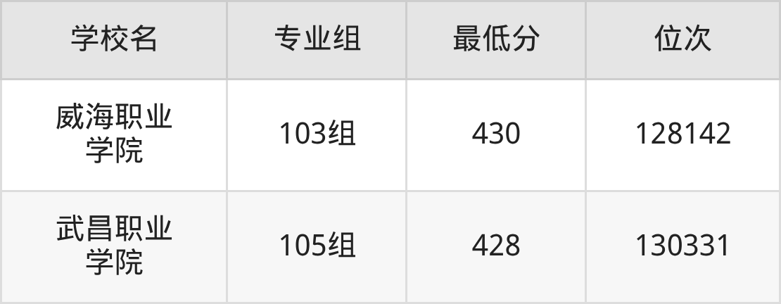 (3)武昌职业学院:2025年定向士官分数线428分,位次是130331名,招生专业组有1个,最低为105组。