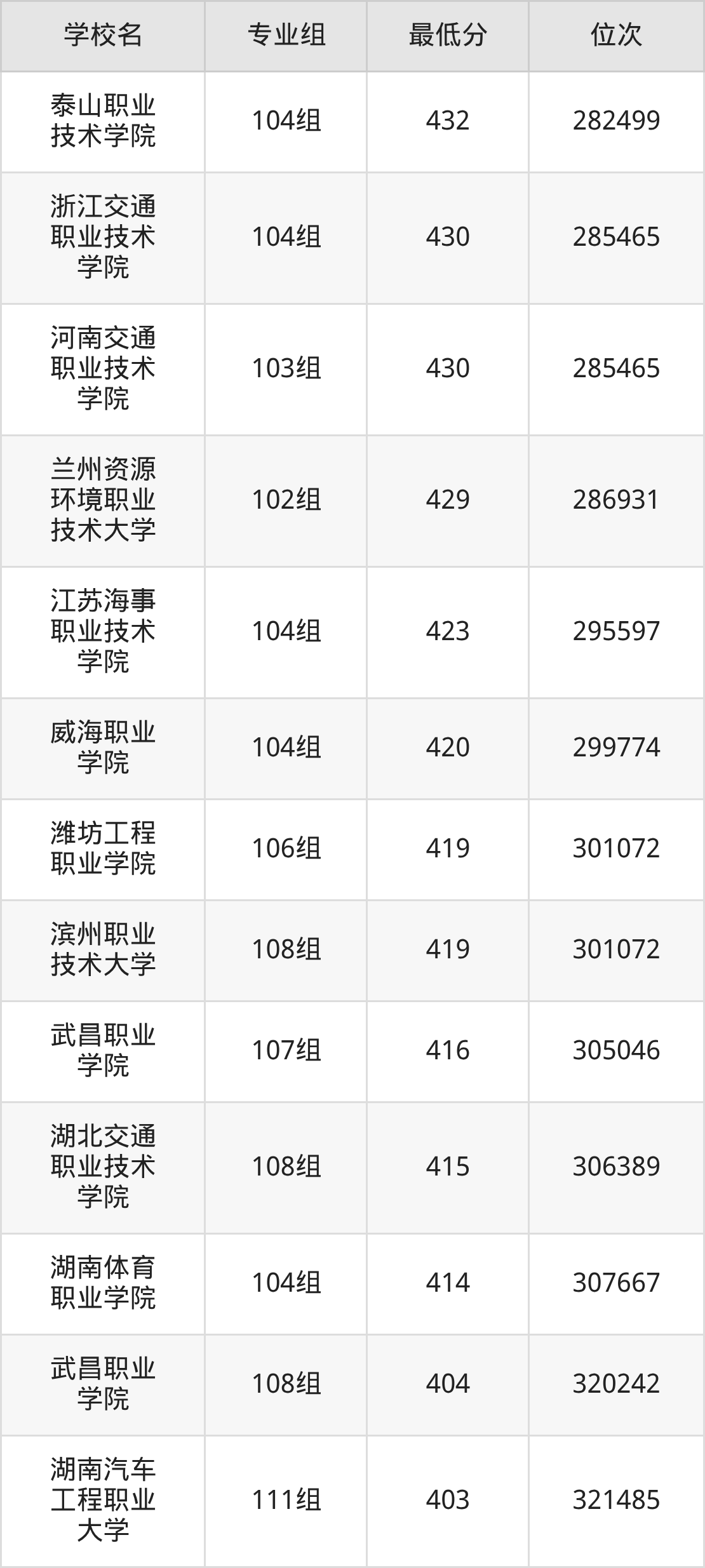 (1)潍坊工程职业学院:2025年定向士官分数线419分,位次是301072名,招生专业组有1个,最低为106组。