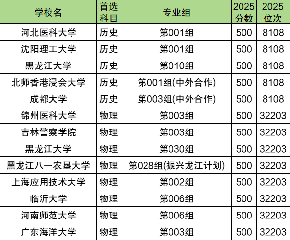 黑龙江高考500分物理类位次是32203名,对应能上的学校有锦州医科大学第003组、黑龙江大学第030组、临沂大学第006组等;历史类500分位次是8108名,对应的大学有河北医科大学第001组、沈阳理工大学第001组、成都大学第003组等,具体名单如下表所示: