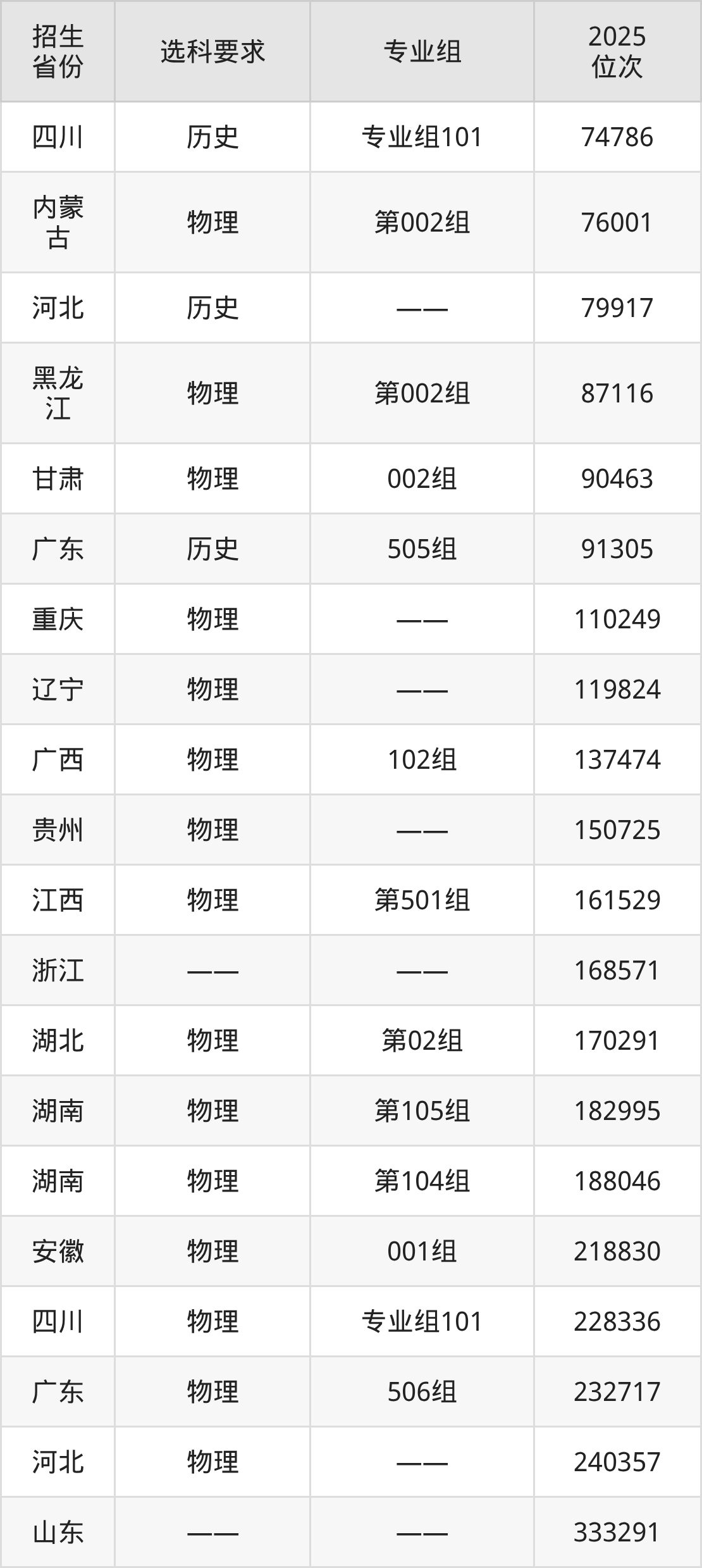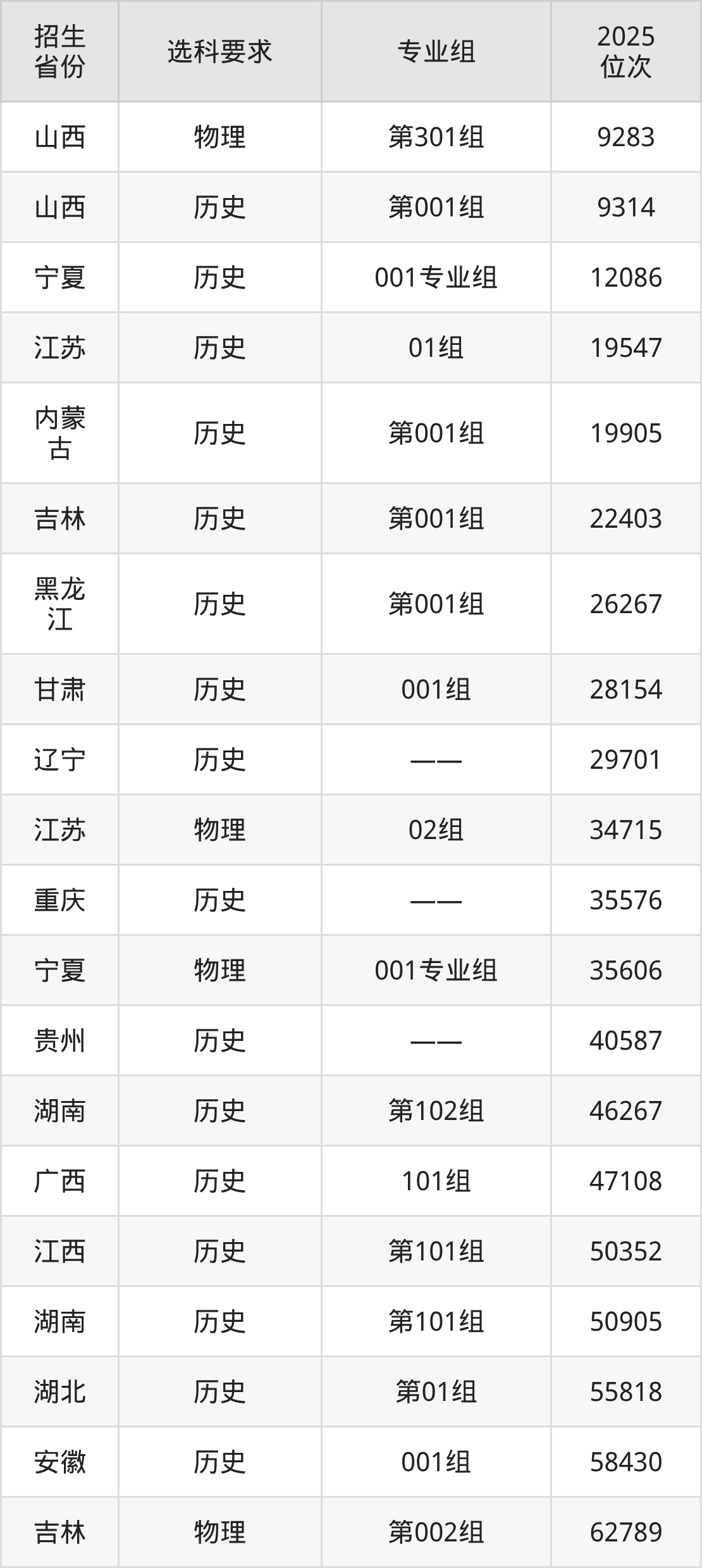 湖南大众传媒职业技术学院2025年在全国各省的位次差异较大,最高位次是9283位(山西物理类)、最低位次是333291位(山东)。各省具体位次请看下图: