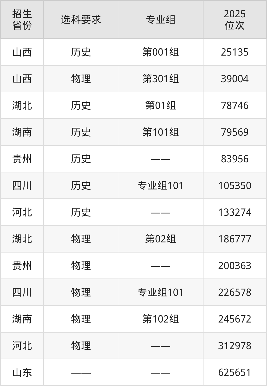 三门峡社会管理职业学院2025年在全国各省的位次差异较大,最高位次是25135位(山西历史类)、最低位次是625651位(山东)。各省具体位次请看下图: