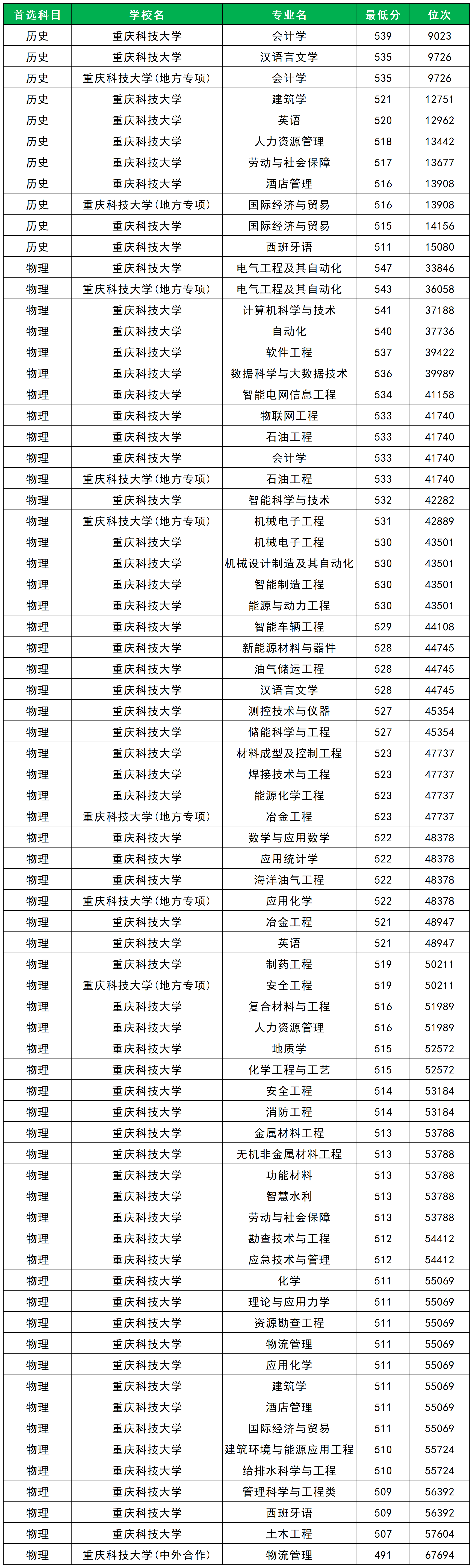 下图展示了重庆科技大学2025年在重庆市的文理科各个专业的最低分。可以看到它虽然属于二本院校,但最低分比本科线高了很多,大部分专业的收分甚至超过了特控线,是一所实力不错的高校。