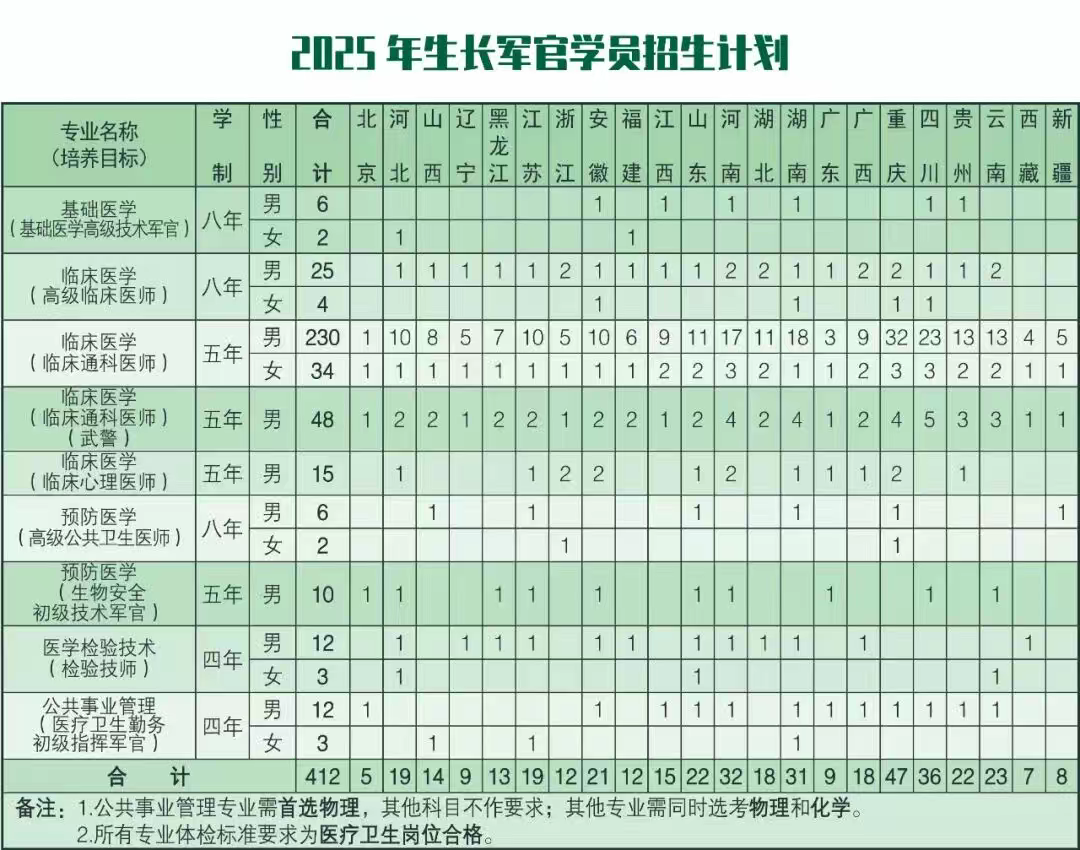 陆军军医大学面向全国22个省(市、自治区)招收普通高中毕业生412名,其中男生364名,女生48名。