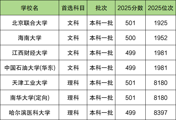 新疆高考500分理科位次是8287名,该分数位次对应能上的学校有哈尔滨医科大学等;文科500分位次是1952名,该分数位次对应的大学有江西财经大学、海南大学、中国石油大学(华东)等,具体名单如下表所示: