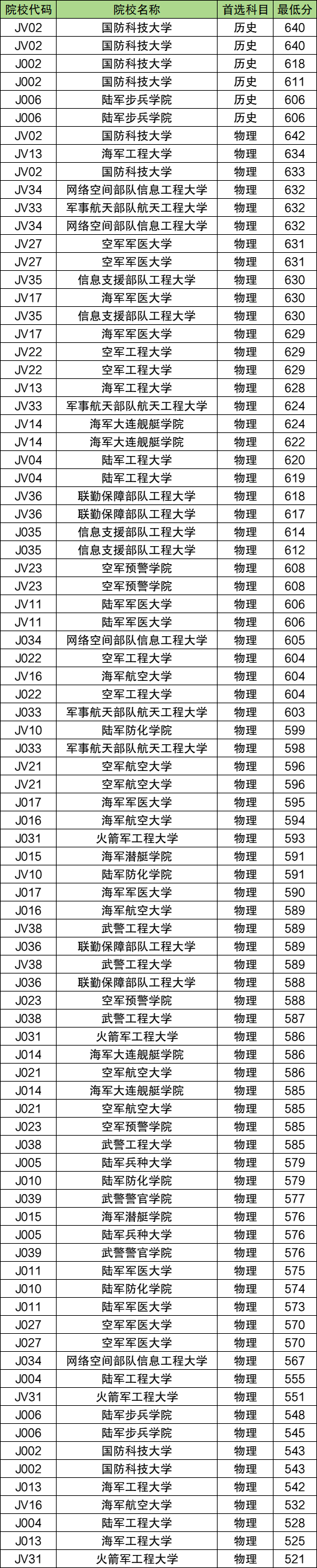 首选物理组的同学可以报考的军校数量倒是挺多的,但是最低录取分在521分以上(火箭军工程大学),也就是说该类同学至少需要521分及以上才能考上提前批军事院校。