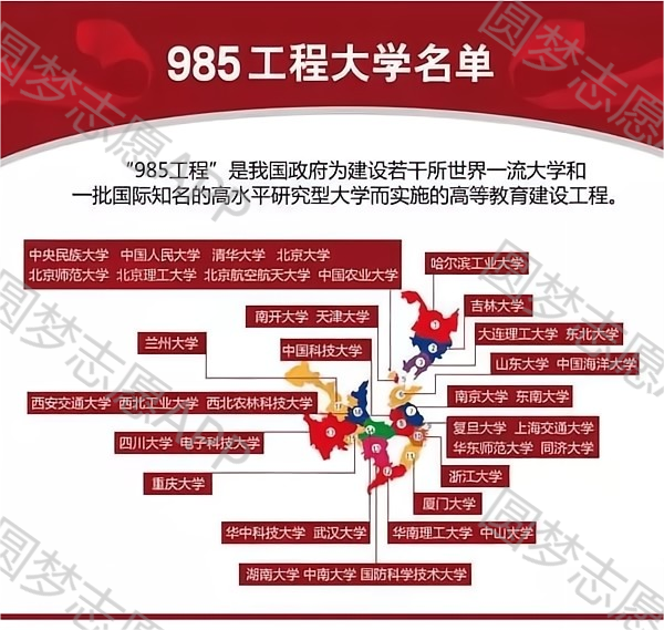 985工程为98年5月由江主 席在庆祝北京大学建校100周年大会上提出的“为了实现现代化,我国要有若干所具有世界先进水平的一流大学。”为建设若干所世界一流大学和一批国际知名的高水平研究型大学而实施的建设工程。现在共有39所985工程大学。
