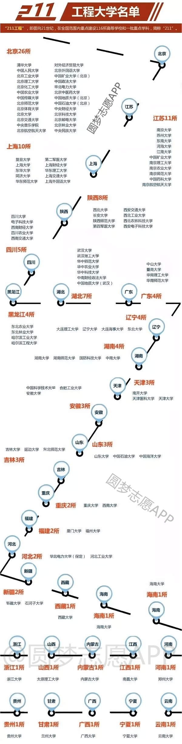 “21”即21世纪,“1”即100所高等学校,意思为面向21世纪、重点建设100所左右的高等学校和一批重点学科的建设工程。于1995年11月经国务院批准后正式启动。目的是使100所左右的高等学校以及一批重点学科在教育质量、科学研究、管理水平和办学效益等方面有较大提高,在高等教育改革特别是管理体制改革方面有明显进展,成为立足国内培养高层次人才、解决经济建设和社会发展重大问题的基地。现在全国共有116所211工程大学。