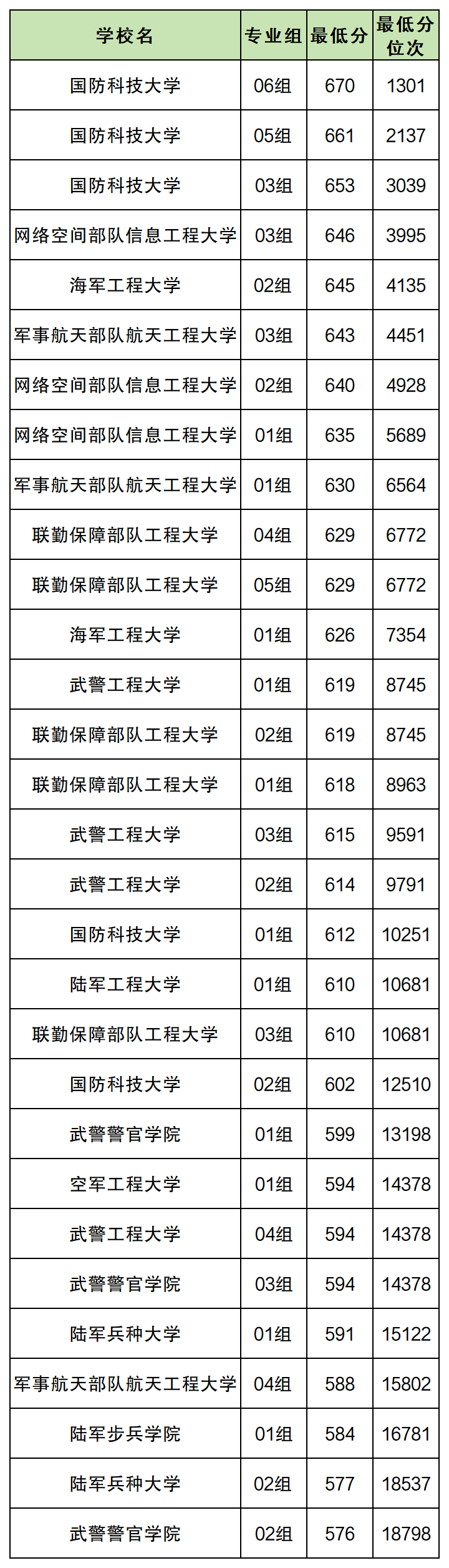 6、火箭军工程大学最低分数线:男生559分,女生578分;
