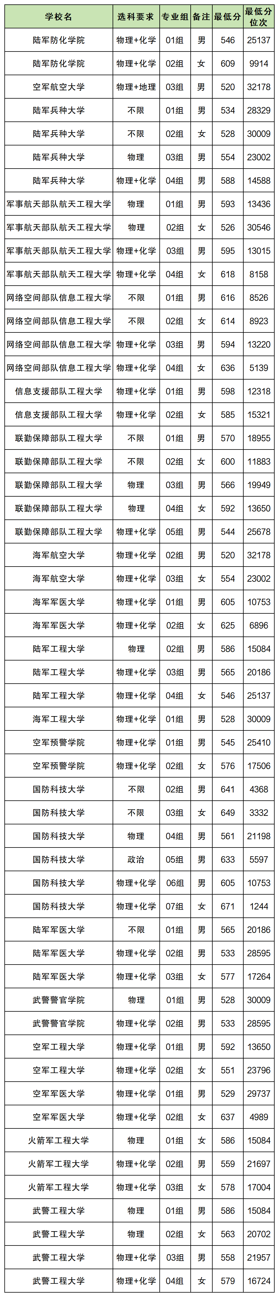 8、联勤保障部队工程大学最低分数线:男生544分,女生592分;