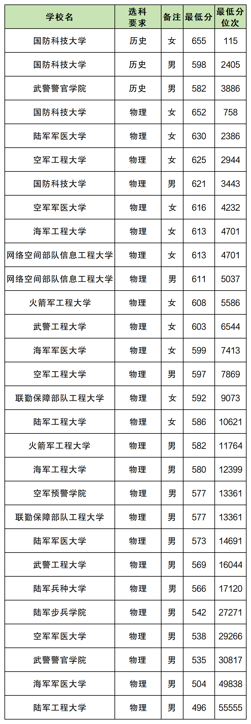 相对来说贵州物理类的女生可选择的军校就会多上一些,但总体的收分就比较高,分数线排名第一是652分(国防科大),最后一名则是586分(陆军工程大学)。