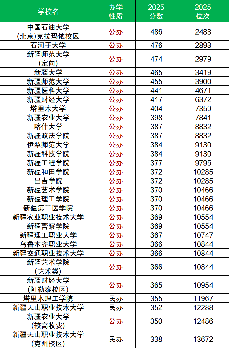 以新疆文科高考数据为例,2025年新疆本科大学在区内招生,录取分数线最高的是中国石油大学(北京)克拉玛依校区,分数线为486分,对应最低位次2483名。其次是石河子大学,分数线为476分,对应最低位次2893名。