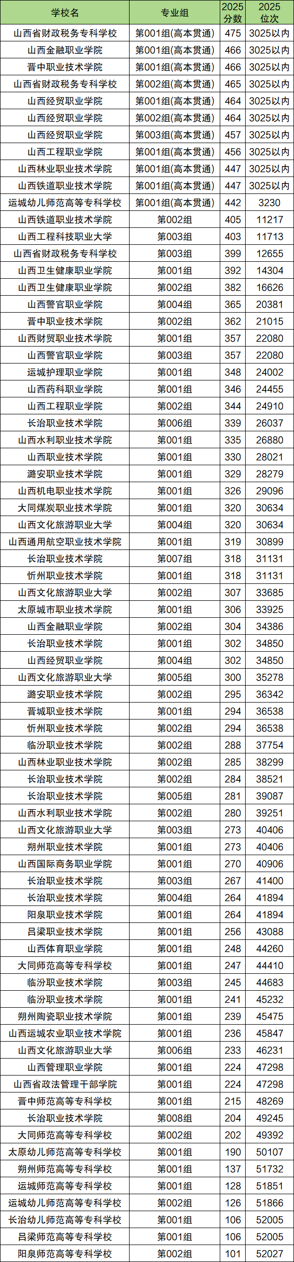 篇幅有限,仅整理了省内公办大专院校录取分数线情况。另外专科位次表是重新排名的,请参考【山西2025专科一分一段表】。