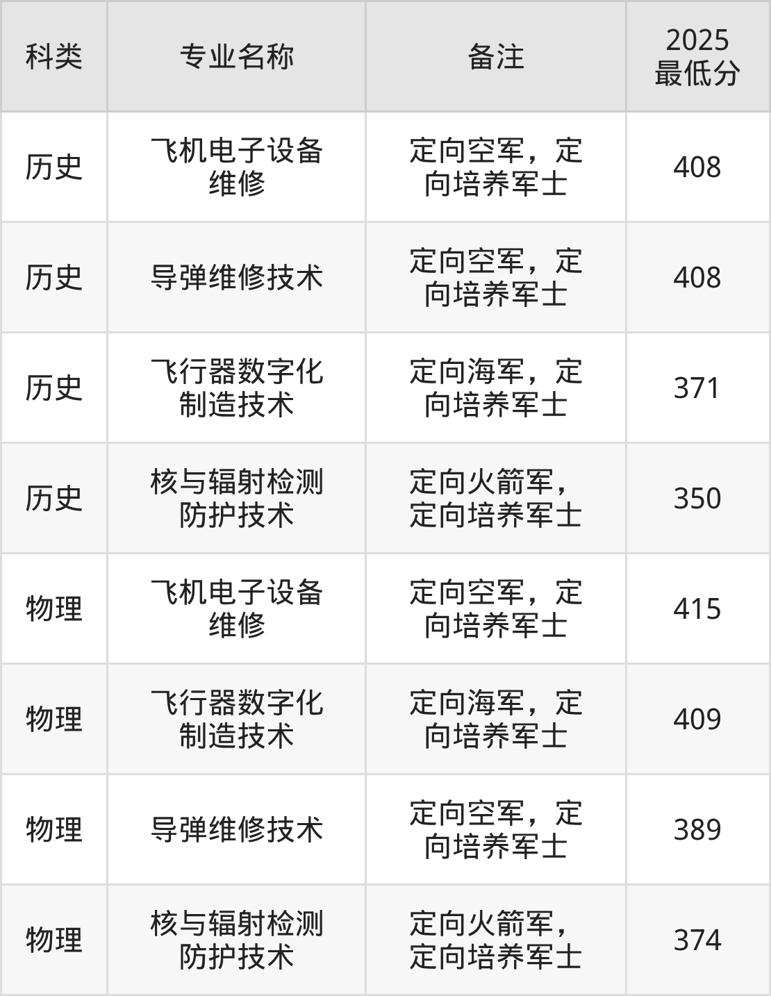 参考2025年招录数据,辽宁定向士官学校分数线范围在350分-415分之间,江西航空职业技术学院最低分350分。