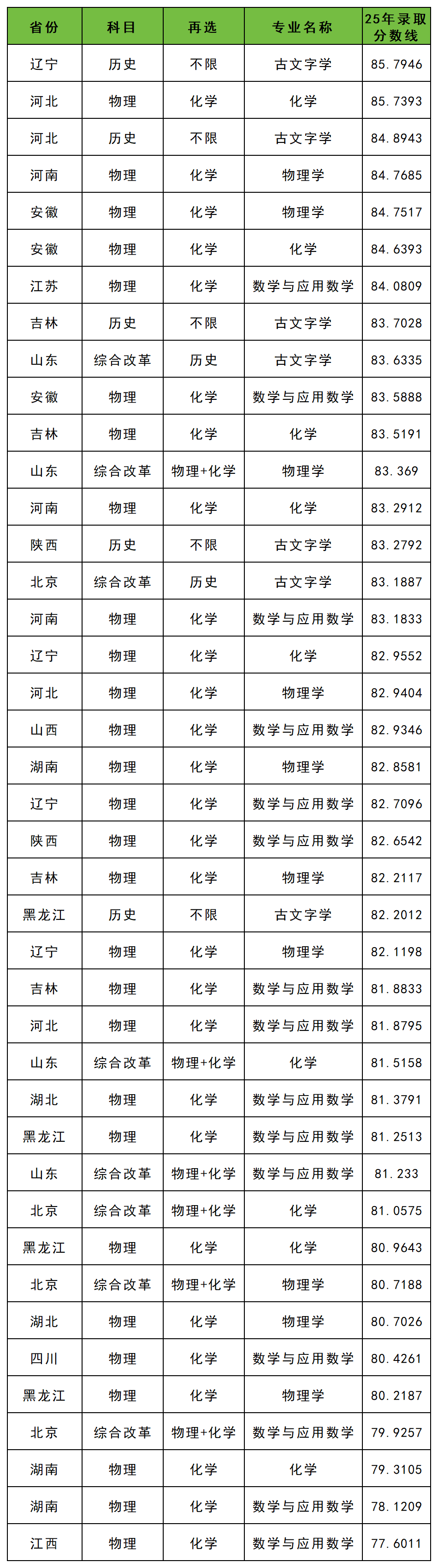 数据显示,吉林大学强基录取分数线基本在80分及以上,其中分数上85分的省份有辽宁(古文字学85.7946分)、河北(化学85.7393分)。