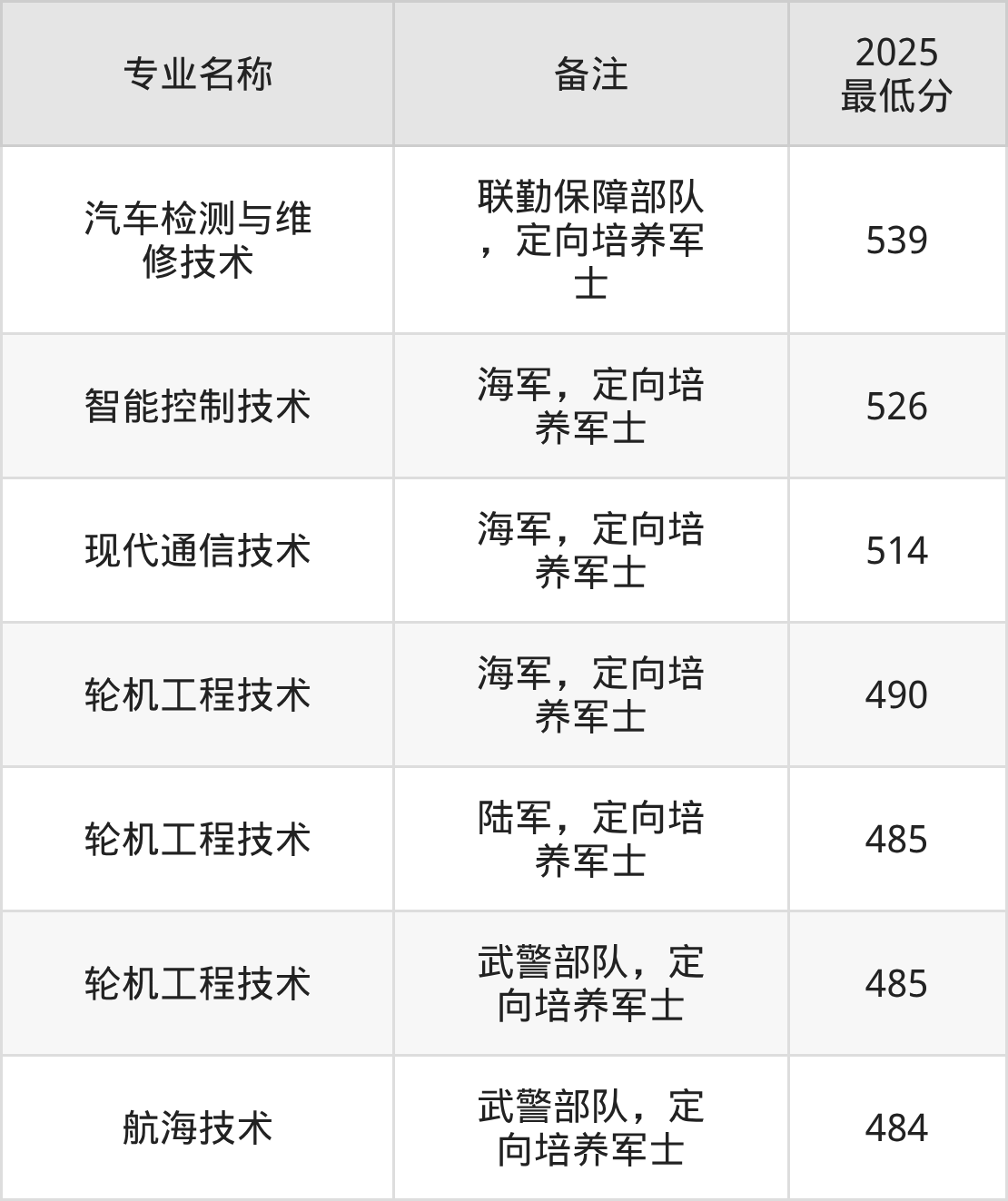 报考定向培养军士的考生,须为2026年参加普通高等学校招生全国统一考试的高级中等教育学校毕业生,年龄不超过20周岁,未婚,志愿至少服役满5年,其政治和身体条件按照征集义务兵的规定执行。考生文化成绩不低于我省普通类第二段线。