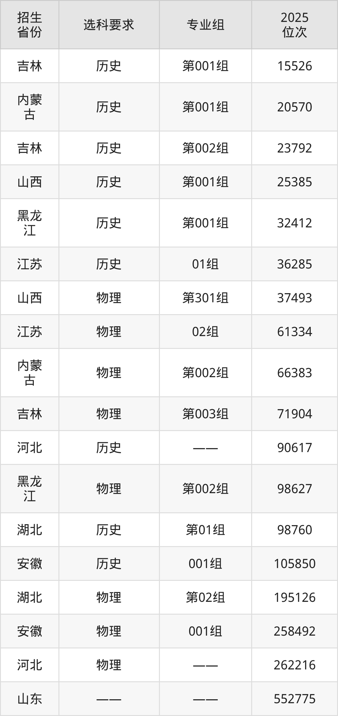 威海海洋职业学院2025年在全国各省的位次差异较大,最高位次是15526位(吉林历史类)、最低位次是552775位(山东)。各省具体位次请看下图: