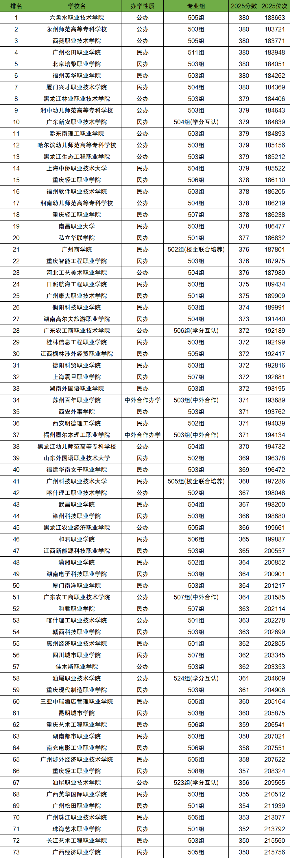 下方表格以广东高考历史类2025年的招生情况为例,展示了全国350到380分的文科大学最低录取分数线排名,共计67所(73个院校专业组),供2026年高考生参考!