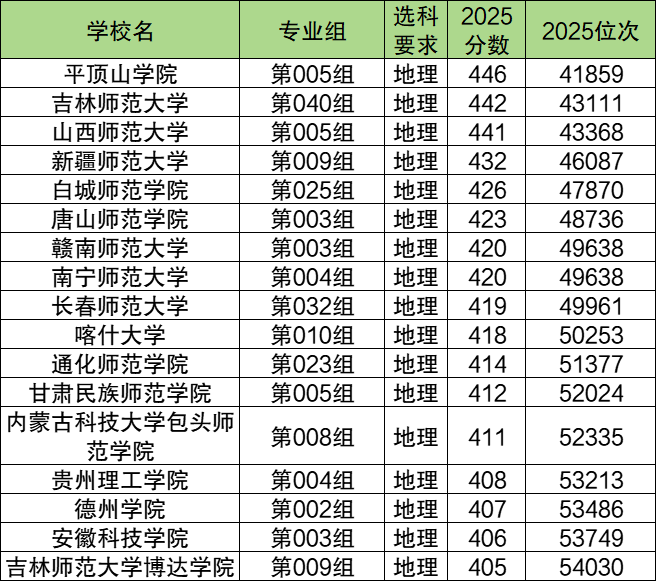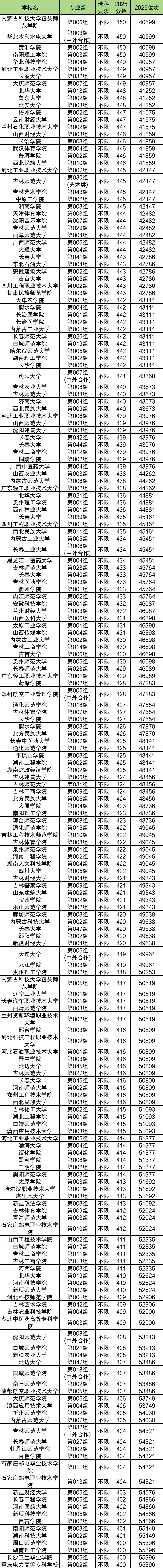 此类选科要求下400分到450分能上的大学中,分数线最高的有平顶山学院第005组,2025年最低分为446分,对应位次是41859名。分数线最低的是吉林师范大学博达学院第009组,2025年最低分405分,对应位次是54030名。