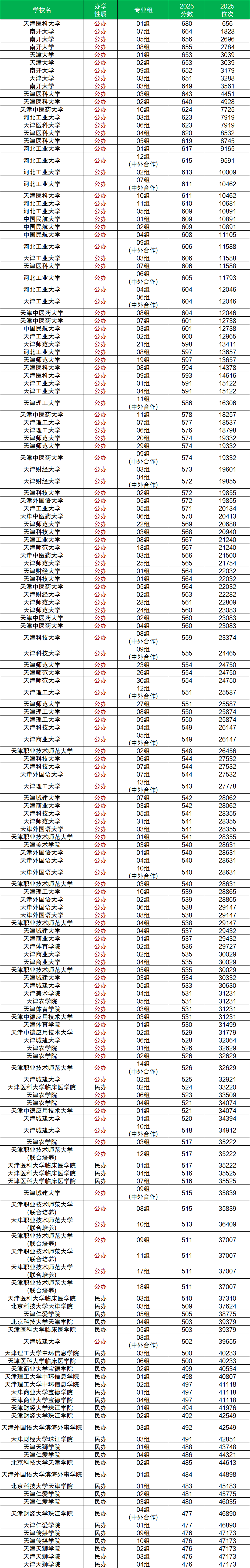 下面是2025年天津本科大学录取分数线及位次一览表: