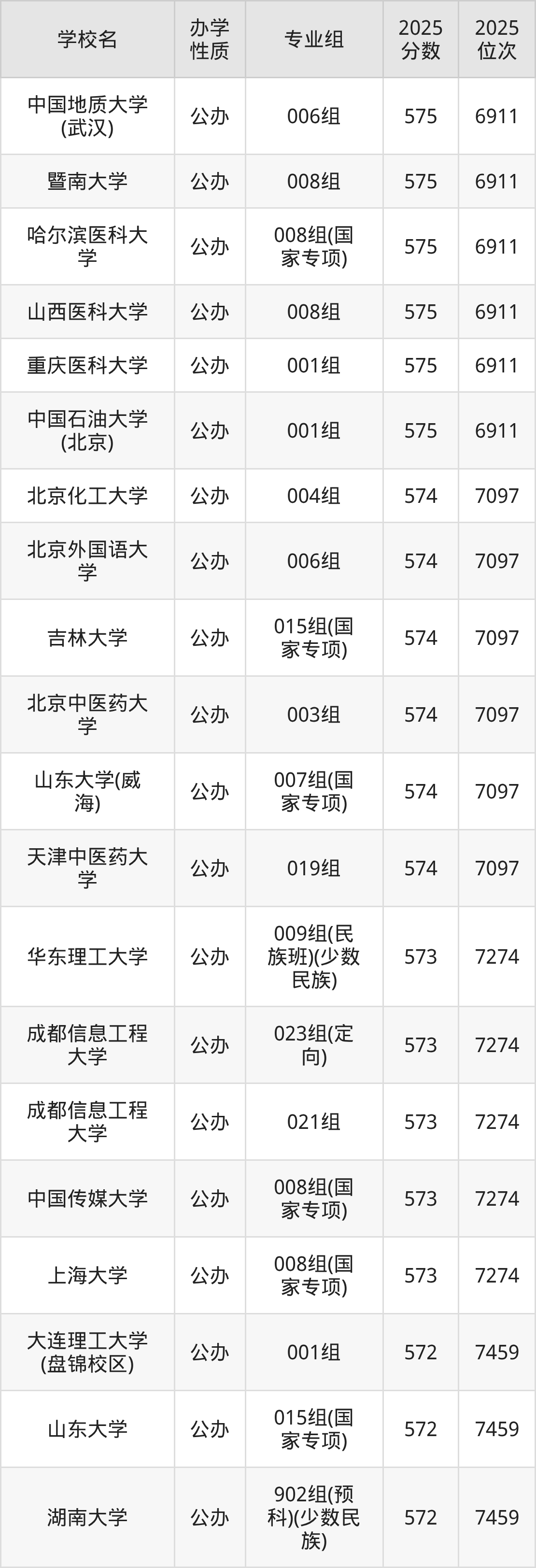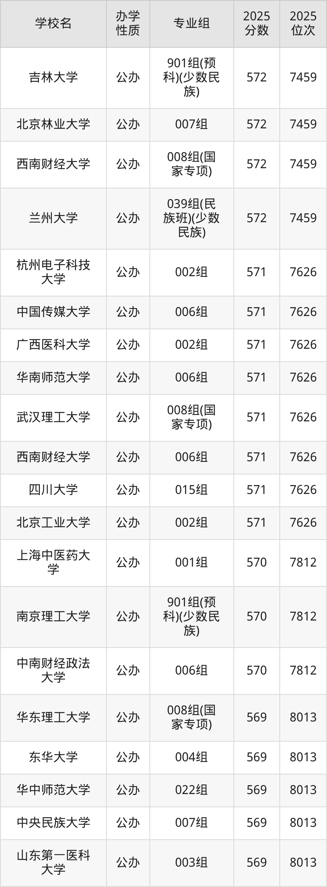 物理组方向570分左右录取的大学中,有49个为普通类专业组,还有3个国家专项专业组(哈尔滨医科大学008组575分、吉林大学015组574分等),1个民族班、少数民族专业组(华东理工大学009组573分),4个定向专业组(成都信息工程大学023组573分、中国传媒大学008组573分等),8个预科、少数民族专业组(湖南大学902组572分、吉林大学901组572分等),8个中外合作专业组(中国海洋大学010组568分、中国农业大学901组568分等),3个单设专业组(东北大学006组565分、重庆大学012组565分等)。