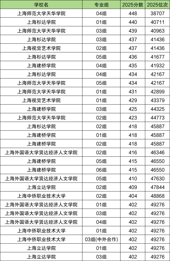 2025年高考中,上海分数线最高的民办大学是上海师范大学天华学院,其04组最低分448分,对应位次是38707位。分数线最低的民办大学是上海立达学院、上海中侨职业技术大学、上海外国语大学贤达经济人文学院等,2025年最低分402分,对应位次是49276位。